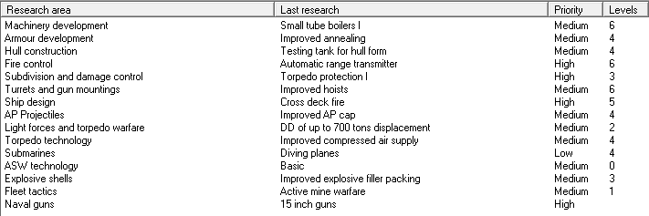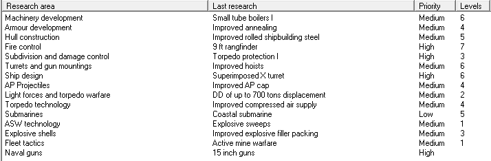 Beyond that, things have been quiet. We've refitted most of our battleships and armored cruisers with improved fire control, and research continues to go well, with the development of main battery wing turrets, cross-deck firing, and improved 14" guns.