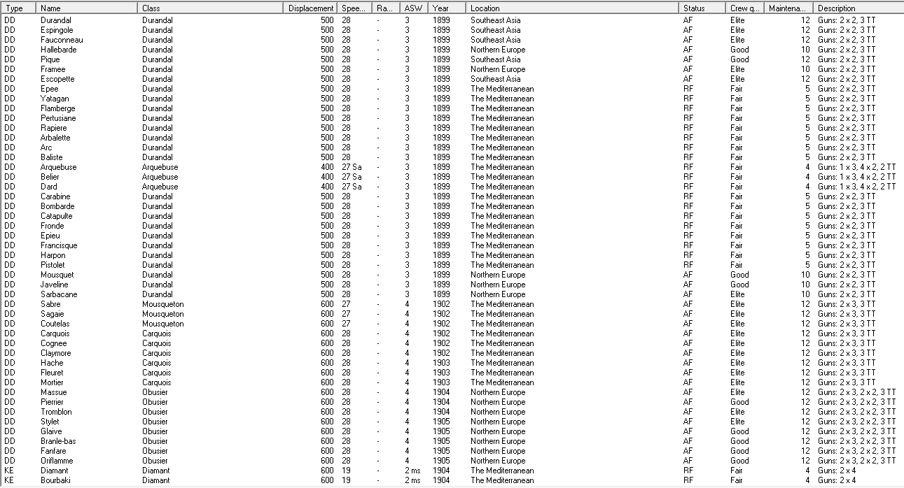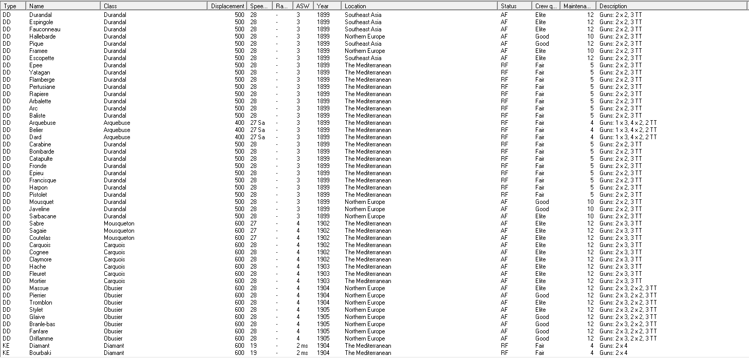 Bs Courbet and Suffren and CA Montcalm enter refit. A new round of dock expansion is ordered. Breakthroughs: Torpedo protection I, Improved compressed air supply. A-H has laid down a BB, Japan a DD. Japan commissions CA. US has halted construction of a B.