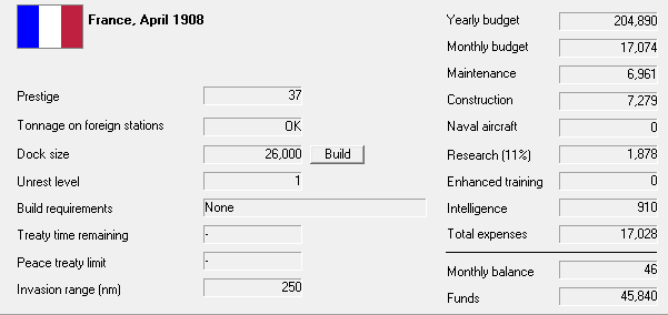 Europe has been at its most peaceful for at least a decade over the last year. This is probably good for us, but it's been bad for our budget. We have only been able to resume construction on the cruiser Forbin, and propose to resume work on Brennus and suspend Charles Martel to ensure that all three ships of the Devastation class finish while still reasonably modern. The upside is that other nations have also been forced to suspend ships, and we are a clear second in the race for the new vessels.