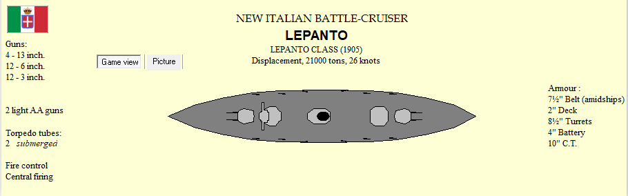 Lepanto is in the same broad category as Von Der Tann and Duquesne. Less armor and smaller guns than our ships, but more speed. I wouldn't have gone with that little armor myself, and it might come back to bite them if they end up in battle with us.