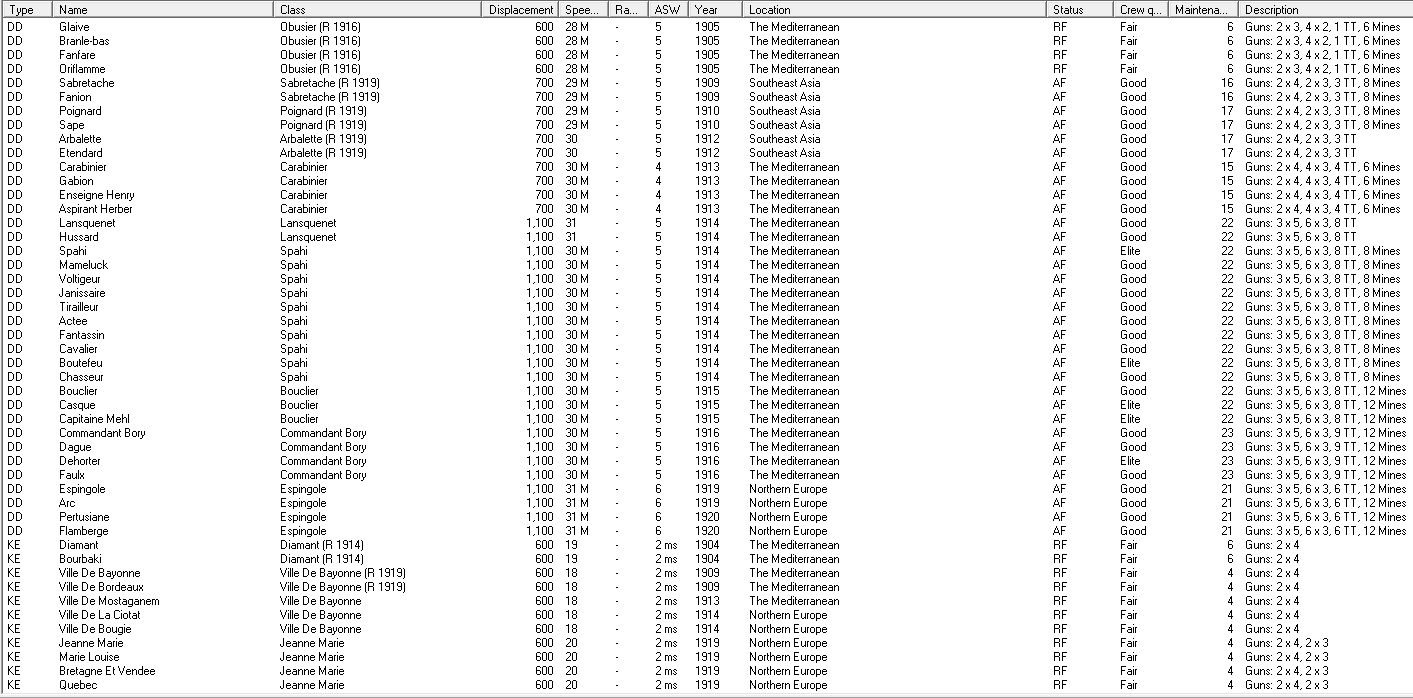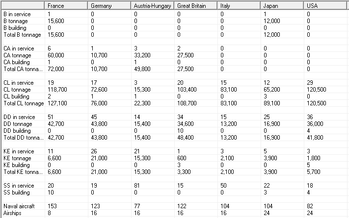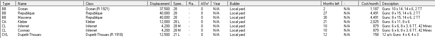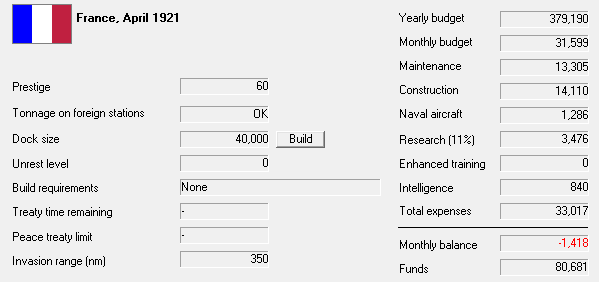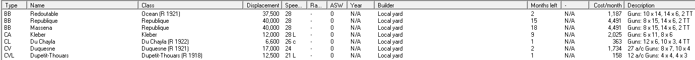 Looks good - I'm impressed by the numbers on the F.66, which will be a fine replacement for the LeO.48 and should make the Sfaxes useful for ASW as well as scouting. I might have gone for more cruisers rather than a second Republique, but we're not doing to badly there, even compared to the Brits. How do you think Kleber will compare with the Austrian CA? Finally, before we lay down some more BBs (which won't be until around 1923) we probably ought to increase our dock size so we can handle 10+ gun 15" BBs.