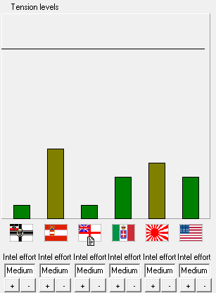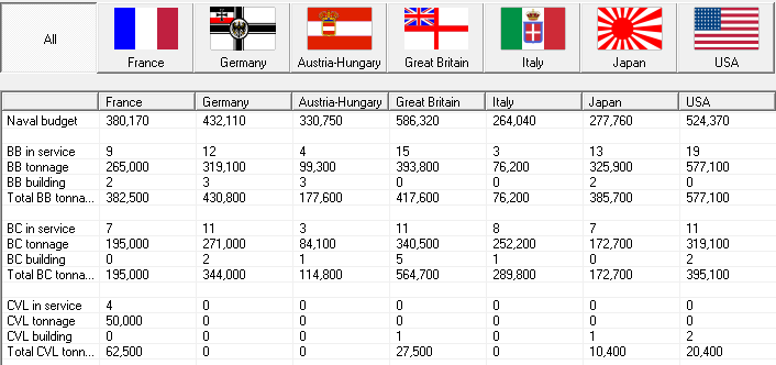 Our spies steal plans for improved 13" guns from the Japanese. Breakthrough: CV conversions. UK lays down 1 BC, 1 AV, Japan 1 CVL. UK commissions 2 DD, US 1 AV.