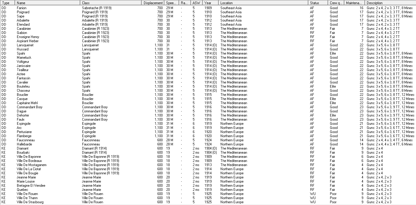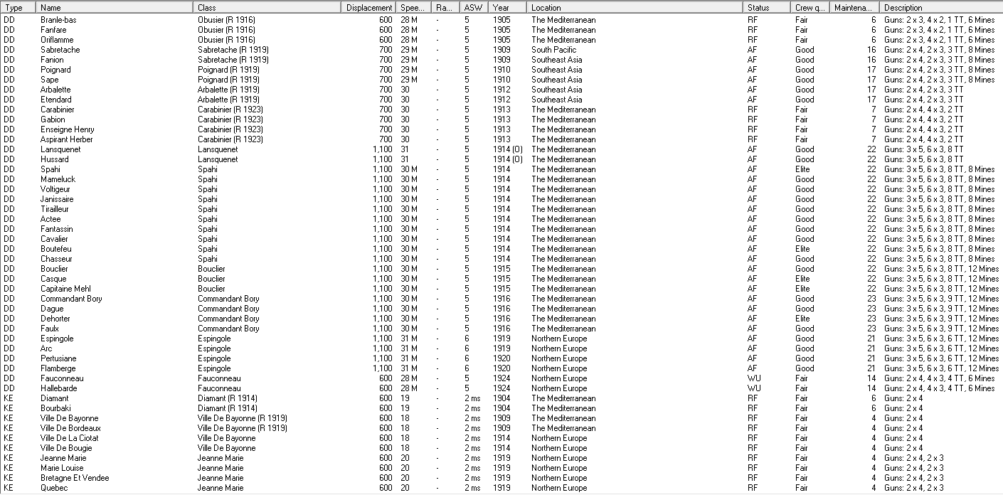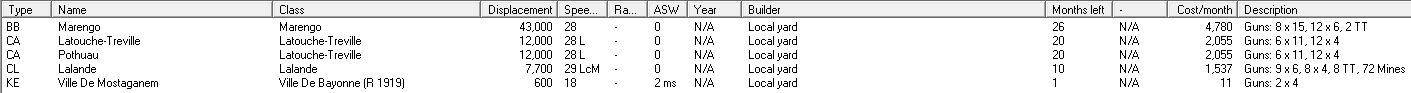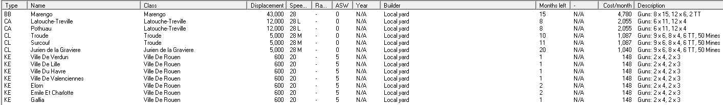 I'm guessing that the second CL will be another three turret CL-23-V? There are a few of our oldest vessels that we could rebuild or scrap. It's probably not worth hanging on to the mothballed Duquesnes, due to the cost of converting them. They aren't too expensive to maintain, but why keep paying if we'll never modernise them? Other old ships that I might retire, include the Arquebuses, Chateaurenault and Bruix. Not sure how much that would save, but possibly enough to think about another KE (maybe a minesweeper to replace the Arquebuses).