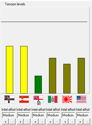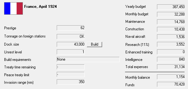 The spike in tensions increases our budget. We lay down CL Surcouf and 7 more KEs. We buy All forward main armament from the British. Breakthroughs: Double reduction gears, Enhanced explosive filler. 18"(-1) guns developed. UK lays down a CVL, Germany commissions AV, CL, Japan a CA.