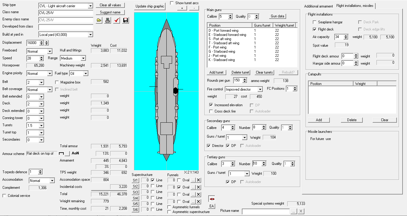I managed to get a 30 kt version of CVL-25-V on 16,000 tons. There's enough margin to get it to 35 planes on a refit if we decide we want it in the CV class. 21-month build time, 2,377/month. So it costs as much as a CA.