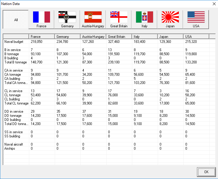 USA increasing naval budget, laying down CL. Japan orders CA from UK shipyard. Dock construction begun. Discovered fleet tactics.