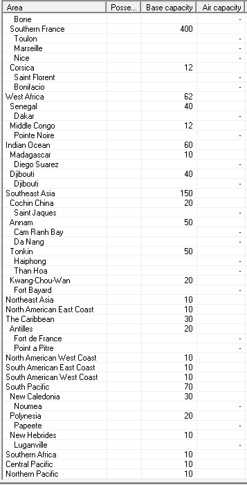 Also, a thought - overseas bases might be worth improving. Right now, basically the whole fleet can base out of Northern Europe, the Med, and Southeast Asia, but any other region will have limited ability to host major fleets. West Africa, the Indian Ocean, and the South Pacific can all be home to mid-sized squadrons, and the Caribbean can host a small-ish force, but I dislike relying on small forces to defend our colonial empire. I'd like to see some improvement to the fleet bases at Dakar, Djibouti, Noumea, and Fort de France over time, as ships and fleets expand. It's not urgent, but as funds allow, it would be a good investment for the future.