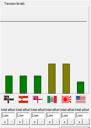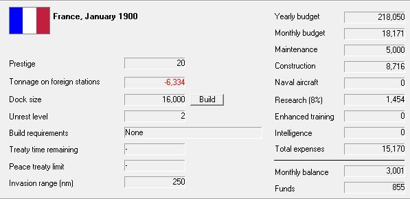 On diplomatic policy, I plan to attempt to remain generally friendly with Britain, the US and Japan, while antagonizing Germany, Italy and Austria. A war with either of the two later powers should be fairly straightforward, while Germany is best faced either very soon or in concert with Britain, because their budget will outpace ours. Overall, an alliance with Britain is our best bet, although allying with Germany against them would also work, and will be pursued if it works out and the British alliance doesn't.