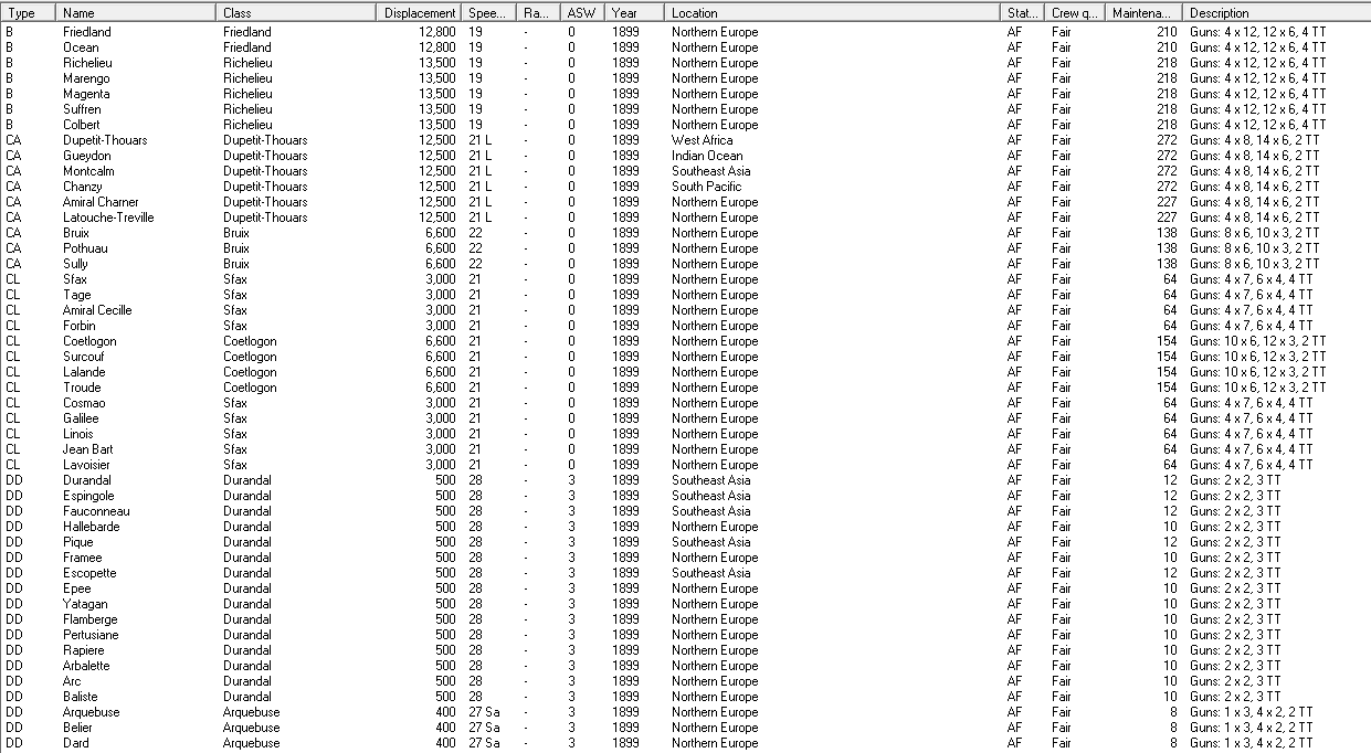 Ah. I should have posted when play resumed this afternoon. DD-01-I is now known as Mousqueton, and four, along with two of an improved design (we got breakthroughs in both hull and engines in late 1901, so I just redid the design and increased the ammo) are currently in the yards. Full report as of January 1902 will be posted Monday.