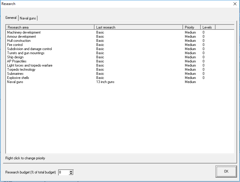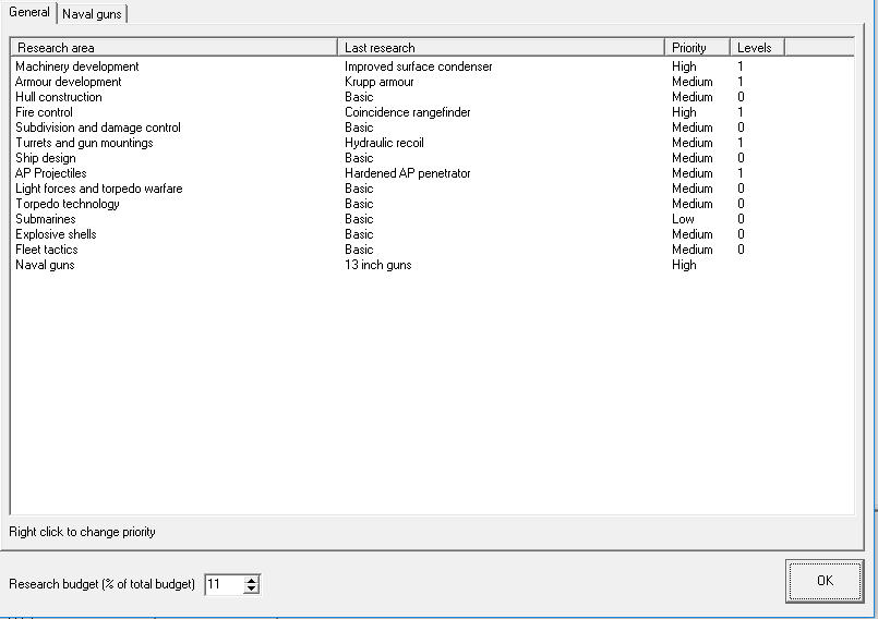 4. Research. Do we want to prioritize any specific areas? Better fire control? Better torpedoes? Submarines? All up to you.