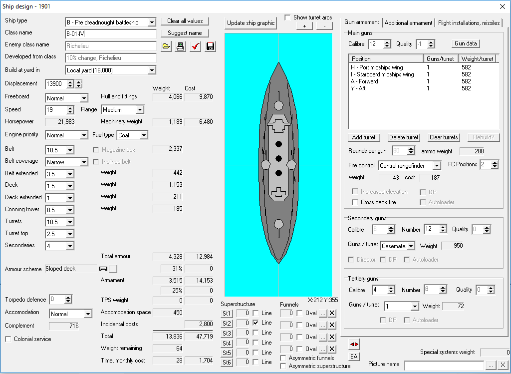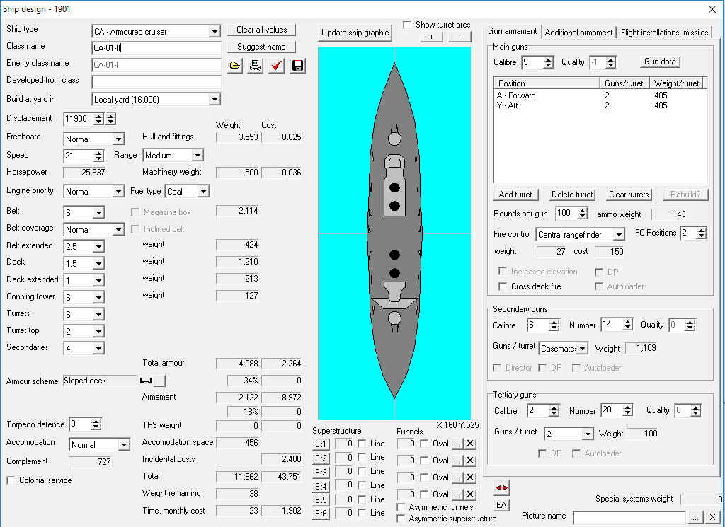 CA-01-I was simply CA-00-I with the benefits of the improved tech we got during 1900 (which auto-upgrade when you open the design, so I couldn't build CA-00-I even if I wanted to now). No extra armor or anything. It's 62 tons lighter, and about 1.7% cheaper. I could cut 100 tons off displacement and make it even cheaper and lighter. The basic design is still good, and I wanted to show that we had made progress.