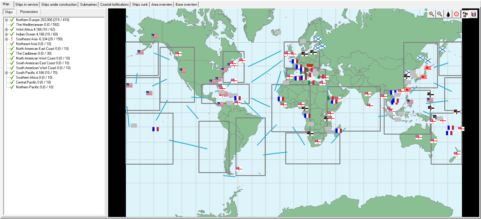 I'd be inclined to make a first priority getting one of those wars, preferably in a zone we already have a base against a weaker foe. Perhaps we can aim to push Italy out of the Indian Ocean? That seems like a good use of CA, which according to John Schilling's reasoning seem like a good future-proof type of ship to start building now. Meanwhile we would want to fortify the Med but play that more defensively, I think. It's not clear to me whether you seize your desired target through invasion, or simply aim to beat up the foe and win the target in the peace treaty.