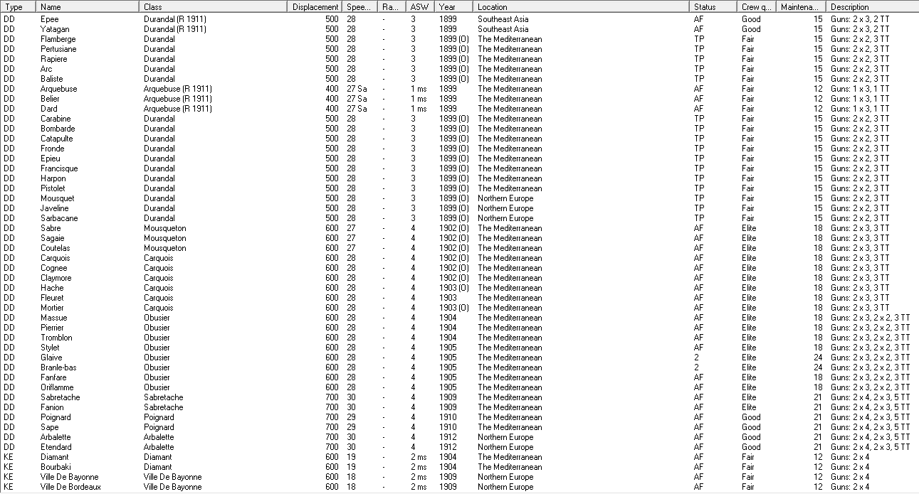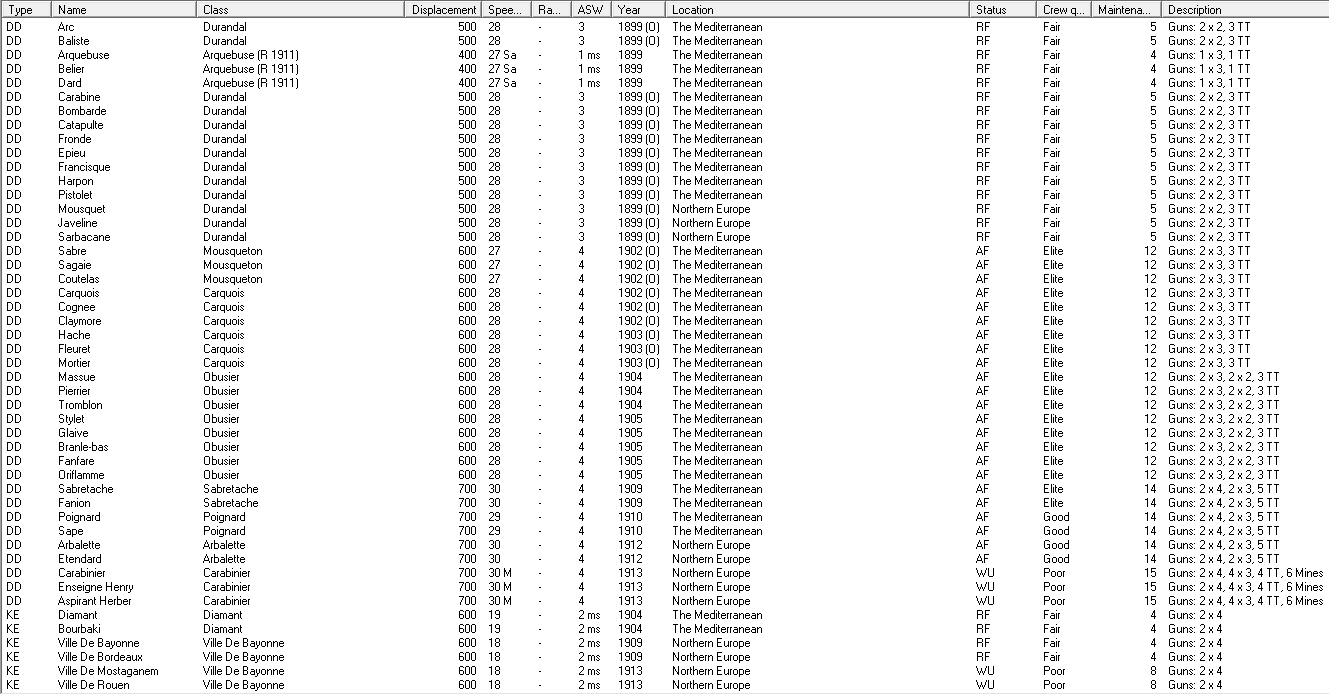 I'm still going to call for more Pascals and Lansquenets. The new quad turret designs are nice, but I'm hoping we can wait till the Rouens are done before laying down more capital ships. Perhaps we could increase our dock size before then, to give us more options. The pre-irresistables are getting on, but I'd definitely upgrade the rest of the Duquesnes, even if its not worth giving them the new 14". We can probably send at least the Friedlands, and some of our CAs to the reserve, perhaps even mothball them if we think we can manage a couple of years without a war. As for aircraft, the future is clearly heavier-than-air, but airships might still be a reasonable investment if that future is a way off.