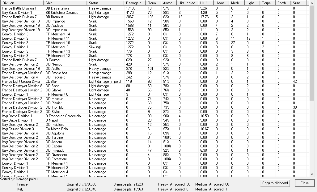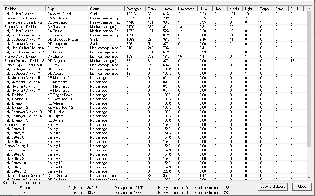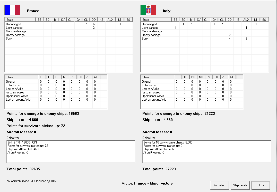 The Italians again decline the chance for a fleet battle off Sicily, giving us 1200 VP. They also decline to attack a convoy, giving us 7755 VP. Lastly, we launch a coastal raid on their east coast, with CL Lavoisier and some destroyers going in to destroy a bombardment target. They run into a group of Italian CLs and DDs, which they brush aside on their way to destroying the target. The force then withdraws towards the British ports in Dalmatia, destroying a KE on the way. A destroyer that got separated from the force picks off a transport. A covering force (AI controlled) took some damage, but it's still a major victory at the Battle of the Gulf of Manfredonia, netting us 1,519 VP and 1 prestige, 227 VP for them.