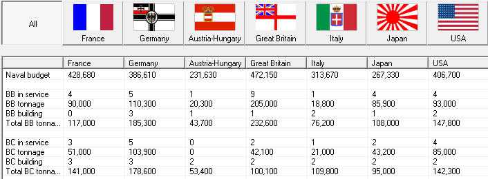 Right. Got through the entire year that time, and it was a rather exciting year, too. We now have the most powerful warship afloat, as well as 10 new destroyers and 3 new light cruisers. And a dock capable of holding 35,500 tons. In 4 months most of the destroyers commission, and we can lay down a new ship or two. We got really lucky with our budget, although the US and Germany are still ahead of us somehow, and Germany is nudging the UK for first place, which really shouldn't be happening.