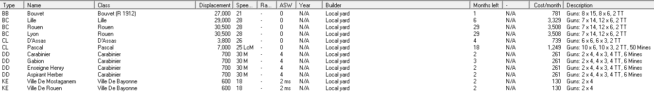 The biggest problem with that is just that capital ships take an awfully long time to build, so that means a 2.5-year gap after the Rouens complete. That's time we can't get back. A good compromise might be to do destroyers only and do a shipyard expansion. They'll both finish in about a year, which gives us a chance for more new tech in the new ship(s).