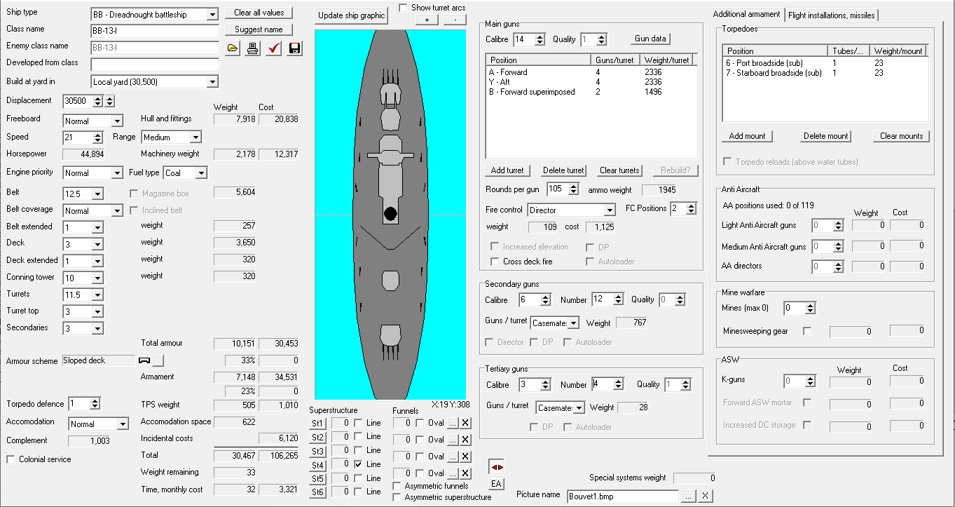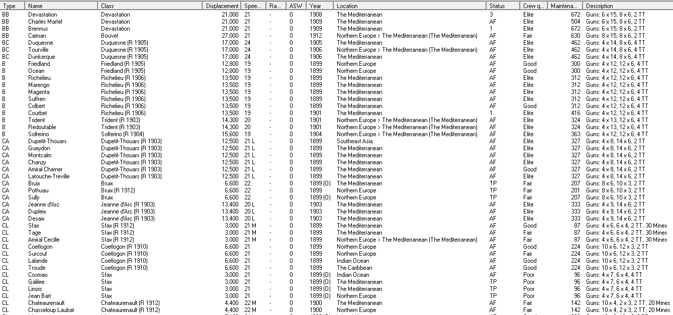 I checked everybody's designs. The British are the only other power to embrace guns bigger than 12" in a big way. The Italians, too, but those are only 13". The US has a few. Germany is still 12" only. Most people are still using wing turrets, and the BCs mostly have belts thinner than the Duquesnes. But this is about the point that usually stops.