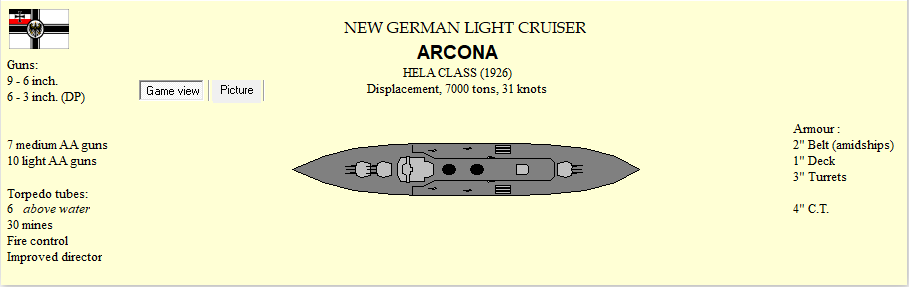 Our spies steal blueprints for German CL Arcona. Breakthrough: Shell dyes, Improved 17" gun (+1). UK lays down a BB, Italy a CL, US 2 DD.