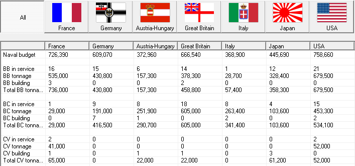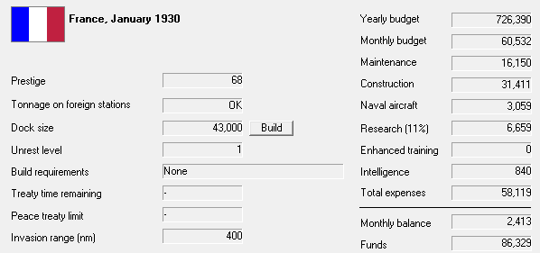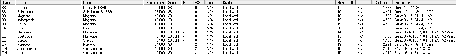 It has been a busy year for us. We've commissioned two battleships, a carrier and 10 destroyers, and, thanks to increased tensions with Germany, laid down a carrier, two light carriers and one heavy and three light cruisers. We also refitted four of our old BCs and started a major modernization for Saint Louis. And we have a significant budget surplus even after all of that.