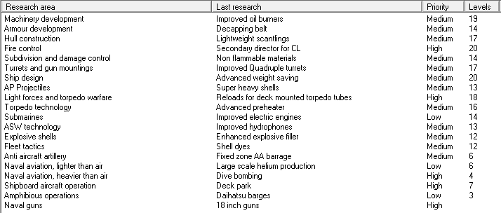 I'll have a more thorough look later, but right now I'd suggest that we drastically reduce our research into naval guns. My understanding is that the maximum possible quality is +1, and we have now reached that in all the calibres we are interested in. 4" (and soon 5") guns we want for DP secondaries, 6" for CL main armament (except for Atlanta type CLs), 10" for CAs (11" for the 'Deutschlands'), and anything heavier is just for capital ships. Since we now have 17" +1s, I imagine that they would be adequate for the rest of the battleship age. I expect we'll want to start our next (and final?) batch of BBs within a year of the Magentas fitting out, but while there is a certain attraction to massive Yamato style super BBs, 17" guns should be enough. Let's make guns low priority.