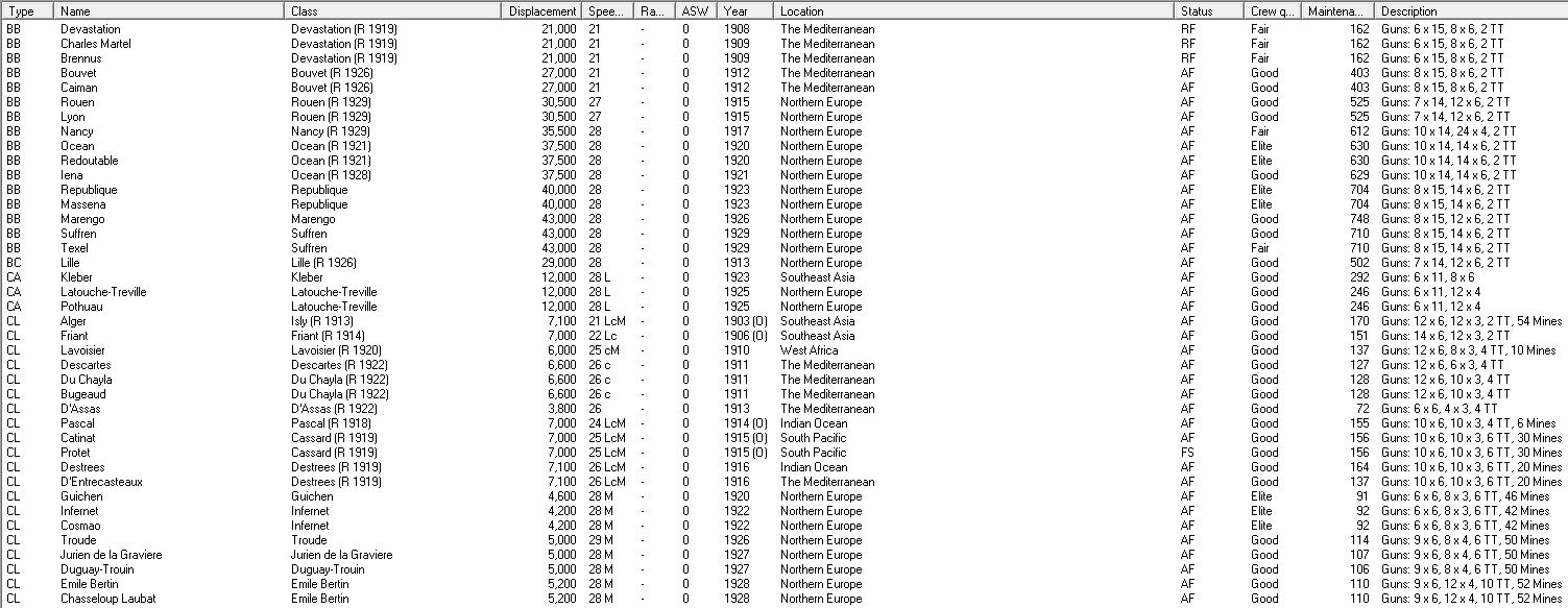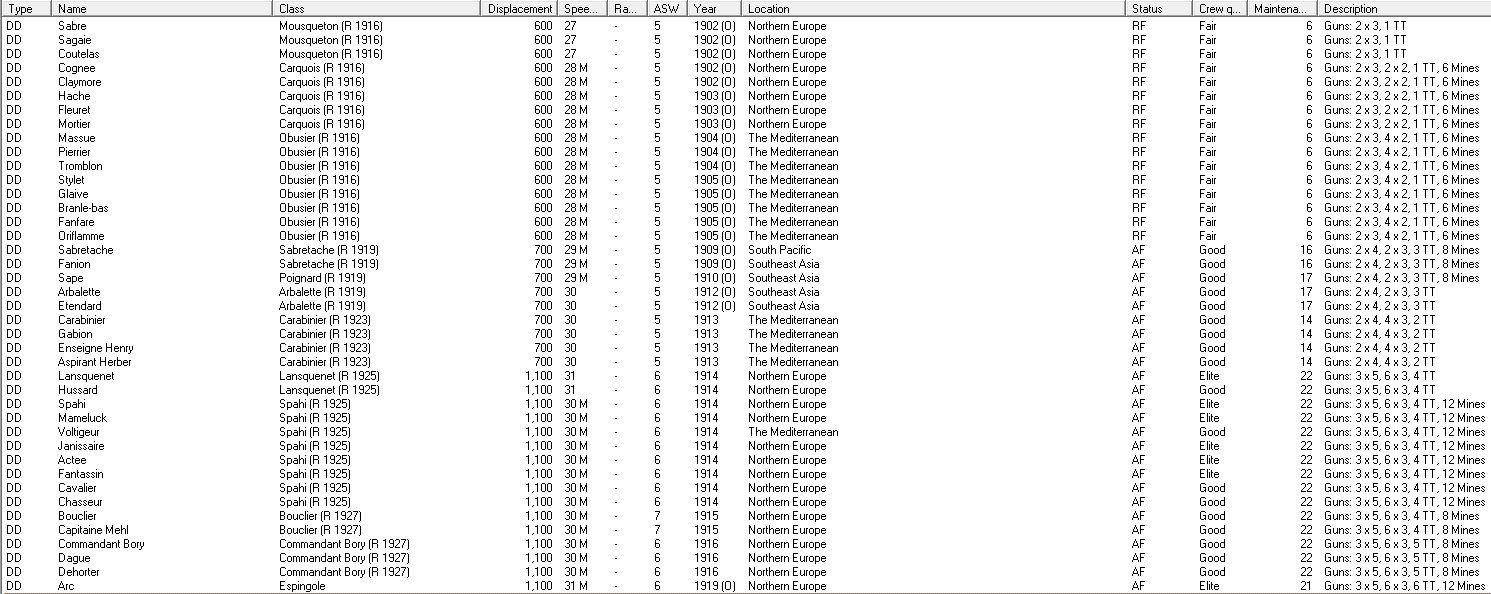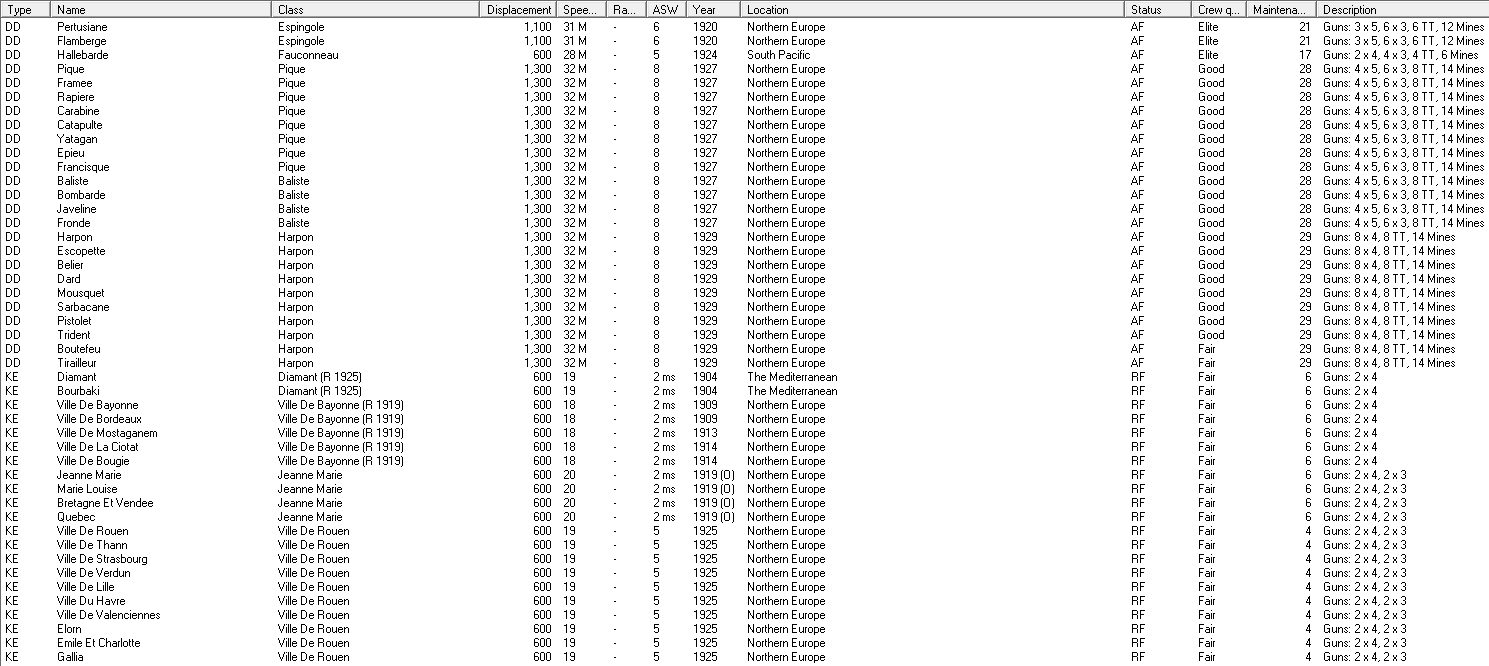 We could do with some new minesweepers (as well as refitting the Jeanne Maries), and ASW corvettes could come in handy too. I seem to remember that we briefly discussed destroyers during the Teams meetup, and some proposal (perhaps specialist AA or ASW DDs) was criticised as impractical as the destroyers would tend to attempt torpedo attacks rather than their main role. If you can remember what that task actually was (apologies), could corvettes be a solution? I'm pretty happy with our current destroyer fleet, as we've got around forty over 1,000 tons, though we'll need more around the middle of this decade.