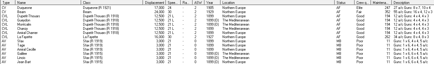 As for the corvettes, that was indeed for ASW, and we can easily build another batch of minesweepers/ASW KEs. I was planning to scrap the D-Ts when the new CVLs commission. Not so sure about Duquesne. Might target her for replacement with the third CV. Ocean will be refitted with Saint Louis is done. Not sure about the cruisers. We could use Descartes and the Du Chaylas to cover while we start the refits.