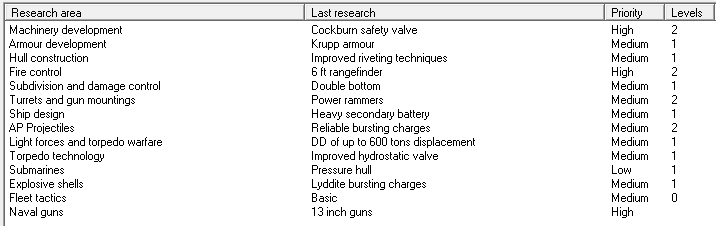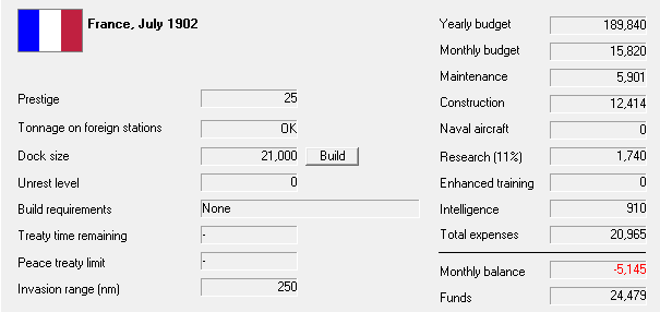 The big challenge for the coming year is for our shipbuilding plans. We should probably plan for whatever is to replace Jeanne d'Arc on the slipway now, so the designers have time to prepare it for building. It could be anything from a minimum-change variant, possibly shrunk to take advantage of new weight-saving technologies to something faster or with more guns or armor. Or it could be a battleship, probably based on the Solfierno design. Or it could be a lot of CLs and DDs. I'm not going to do sketches right now, but I'll provide them on request.