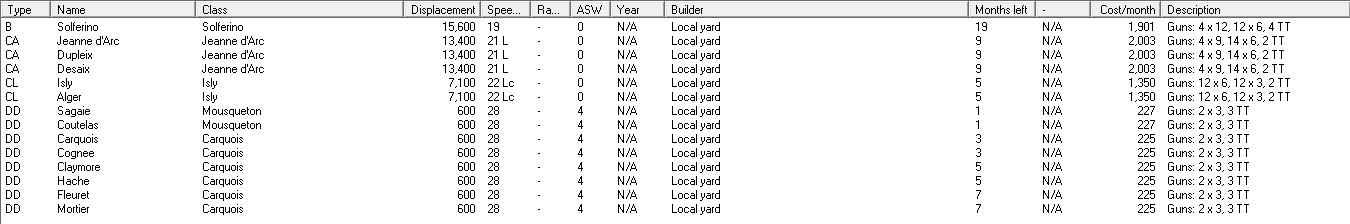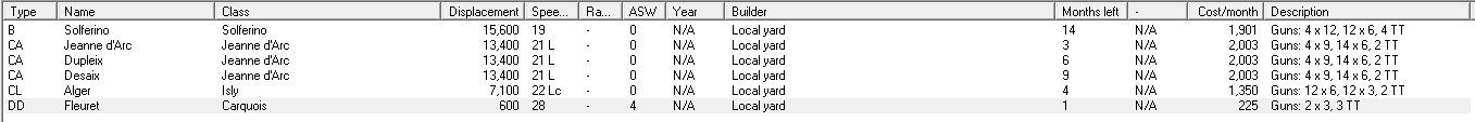 Shame about the budget though... I don't want to delay Solferino any further, since we're down a from the war and 19 months is already a long time. Maybe delay two Jeanne d'Arcs and an Isly, with one of the Jenne d'Arcs first in line for resumption?