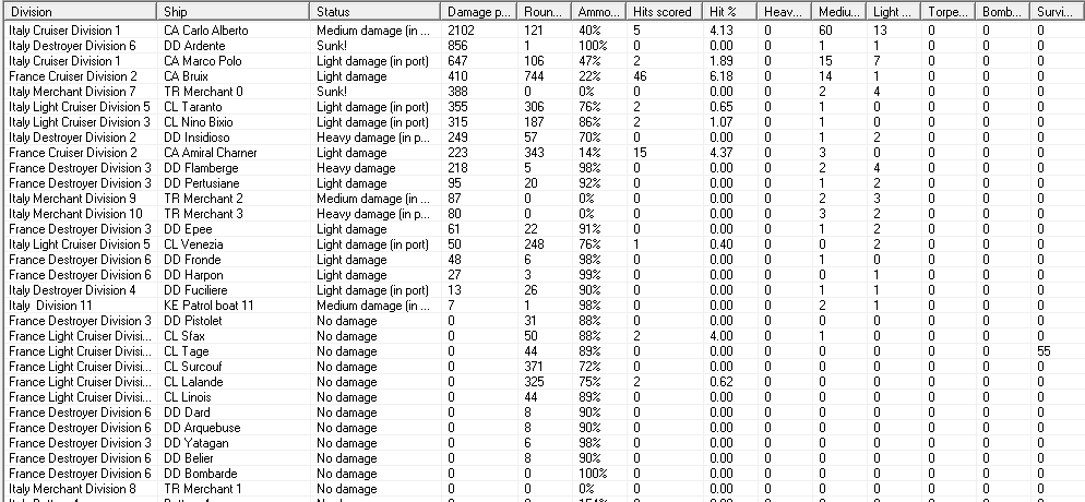 The finally tally is one battleship sunk each, with them also losing a destroyer and us a merchant ship in the early phase of the battle. Total score is slightly in their favor, and their gunnery looks to have outperformed ours somewhat. VP is 2462 to them, 2266 to us.