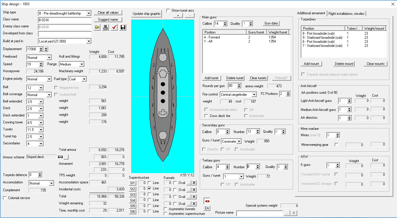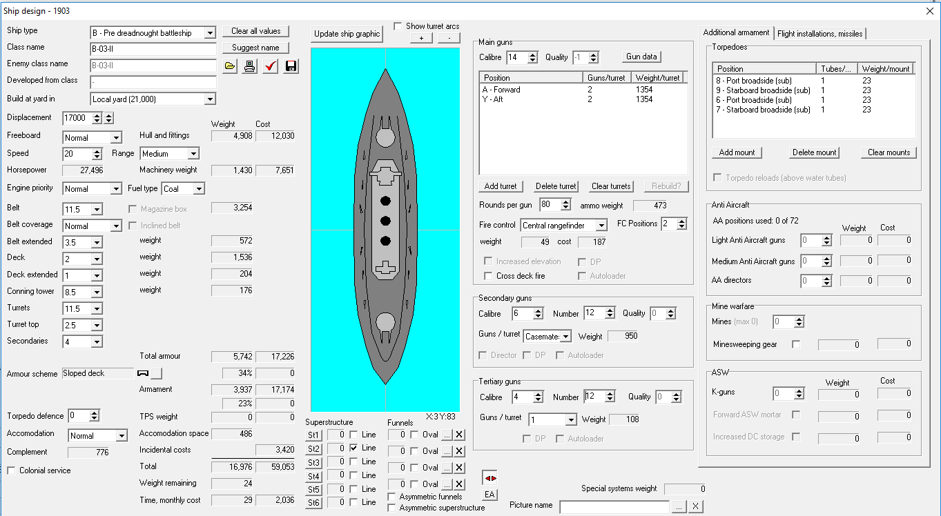A Solfierno armed with 14" guns comes to 16,300 tons, but that's somewhat overgunned, at a cost in ROF and accuracy, and the game recommends 17,000 tons. That gives us either an extra knot of speed or an extra half-inch of both belt and deck armor.