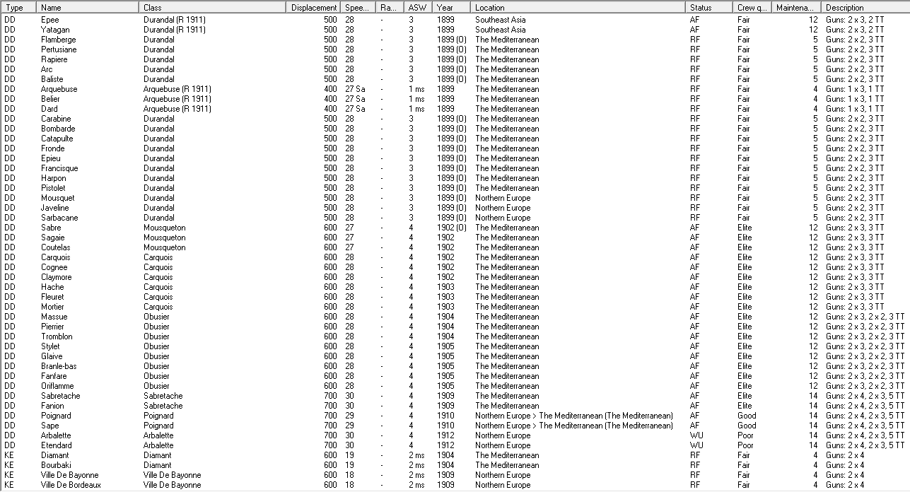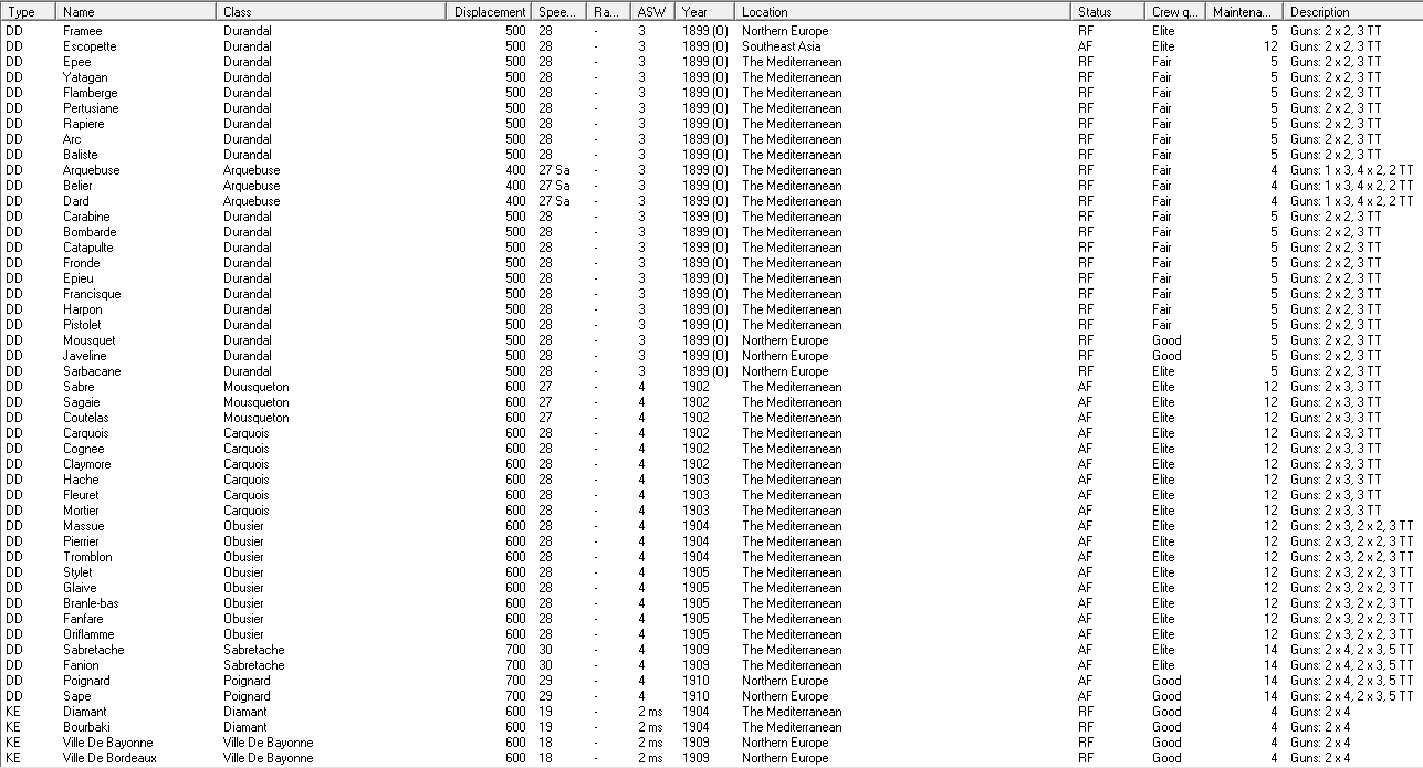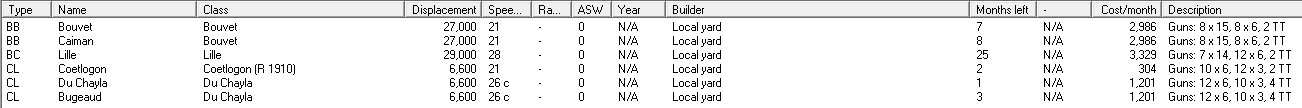 A question on the cruiser composition. We basically have three options. First, the standard fleet cruiser (Du Chayla is the latest in this line). Second, the long-range colony cruiser (Isly/Friant). Lastly, the trade-protection cruiser (D'Assas). That one is significantly cheaper (an extra four destroyers over the 20-month period). Which do we want to build?