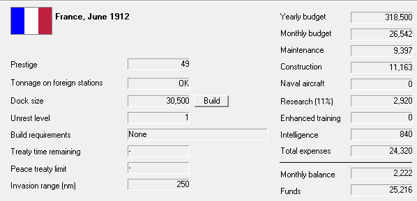 Bs Friedland and Ocean are sent into reserve. Design work begins on DD Carabinier, which uses twin torpedo tubes and the new mine rails. Improvements in productivity boost industrial production. 2 DDs commission into the Navy. Due to the threat from Italy, the PM authorizes additional naval spending. We sell the US Better steel quality.