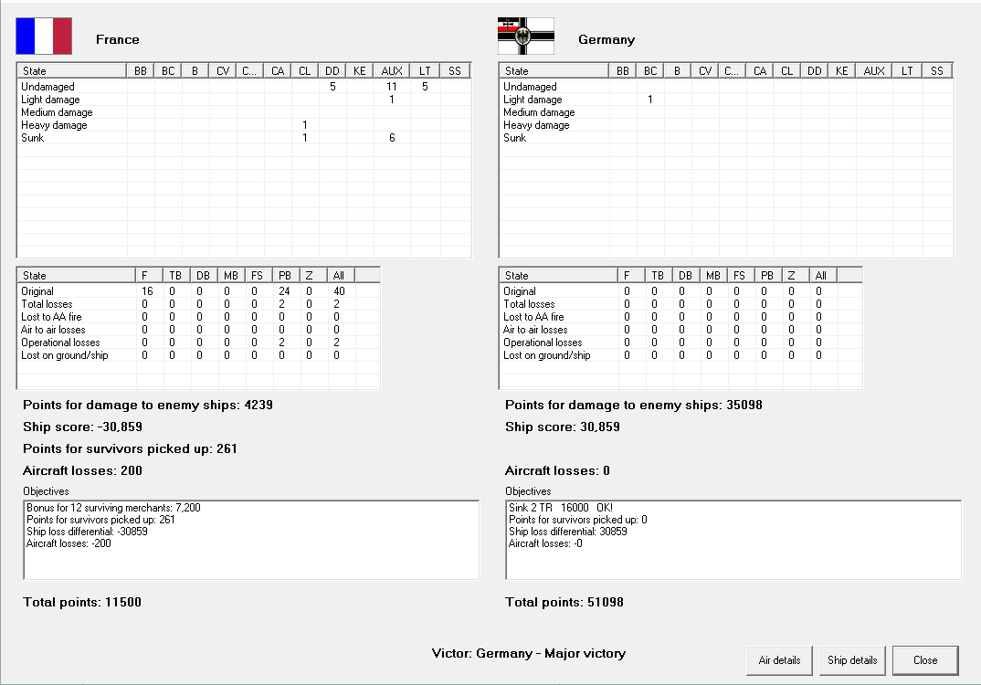 Raid on enemy coastal shipping in the German Bight. 1 BC, 3 BBs, 2 CVs and a CVL with escorts. Fortunately, bad weather means the German planes are unable to attack. Unfortunately, the Germans manage to get behind us, and we're forced to try to get around them. Despite some scary moments, we're reasonably successful at this, and on the way out, discover a German CVL within gun range. Unfortunately, dusk shrouds it, but not us from their battleships. The result is a long, running battle before full darkness falls. Several of our ships get rather beaten up, but we end up only losing three destroyers, while sinking a German battleship. The Battle of the German Bight is a minor victory for us, 7,565 VP vs 5,083 VP, +1 prestige.