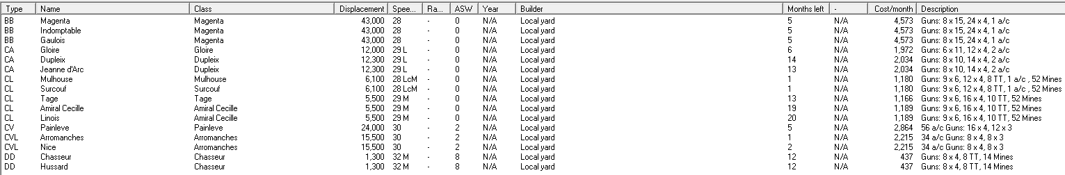 BBs and BCs - Retire the Devastations, and send Lille and the Rouens to the Med. I think we can wait a year or so before laying down more, but would be interested in seeing a 17" design.