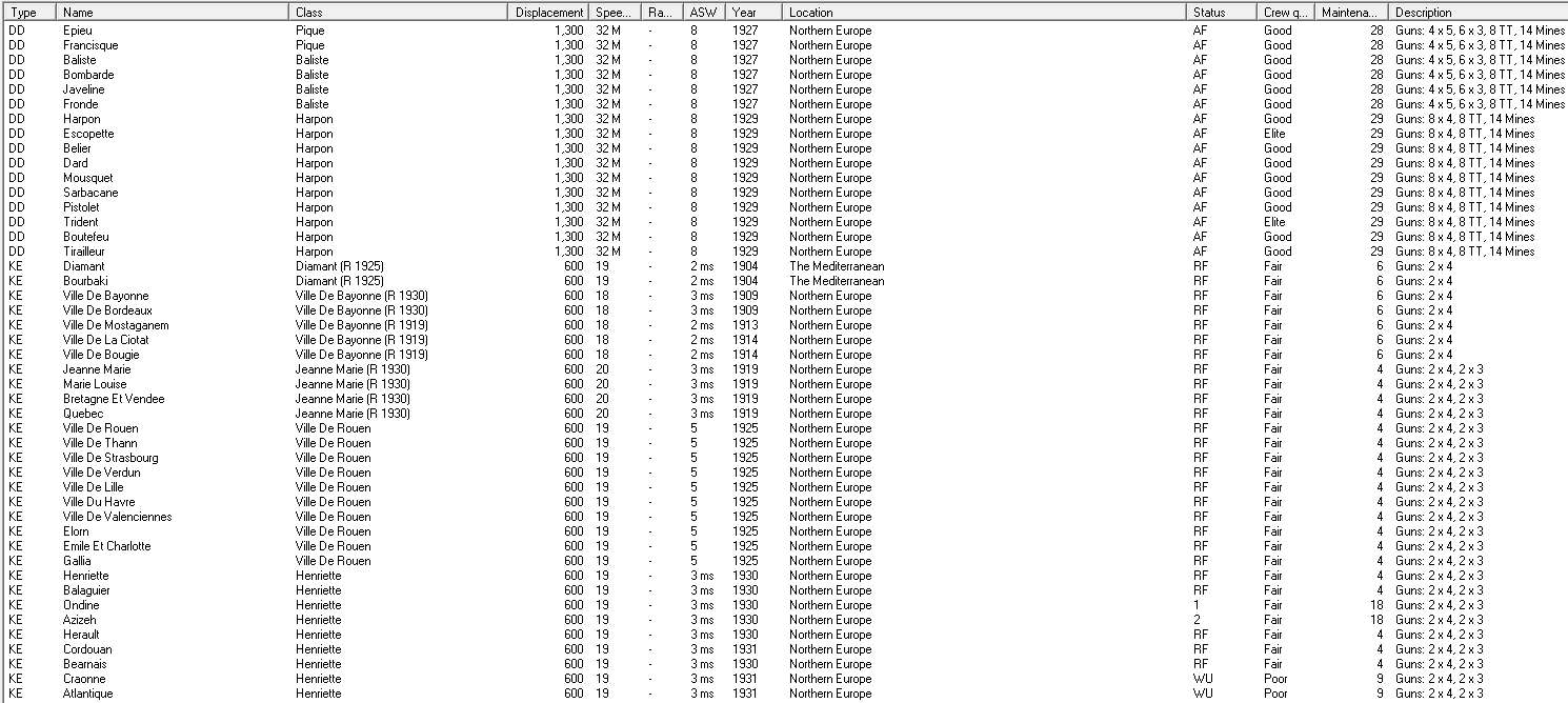 Destroyers - Retire the Sabretaches, Arbalettes and Poignard. Send the Carabiniers out to replace them. We'll want more DDs in a few years time, but I'm hoping that by waiting we might have 5" DPs to arm them with.