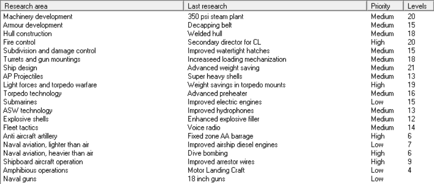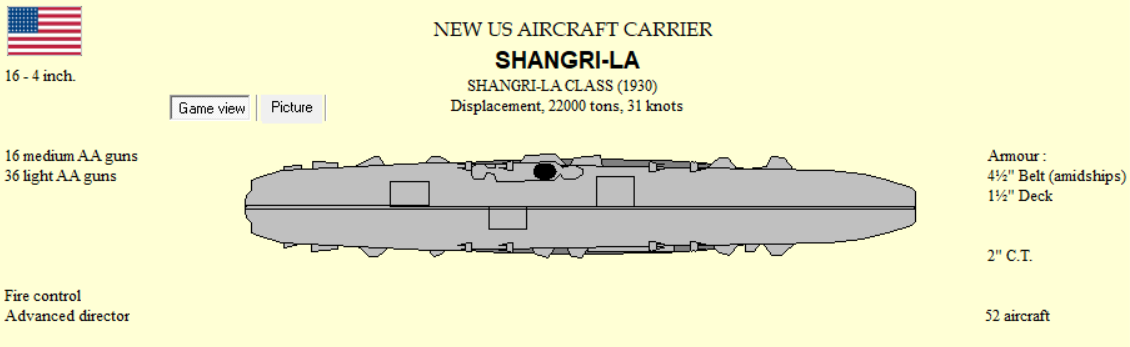 Our spies steal plans for improved 12" guns. Breakthrough: Improved arrestor wires. Germany commissions a KE, Italy an AV, US a CA. CVL Dixmude laid down. 2 CLs scrapped in Southeast Asia. Design work begins on CL Alger.