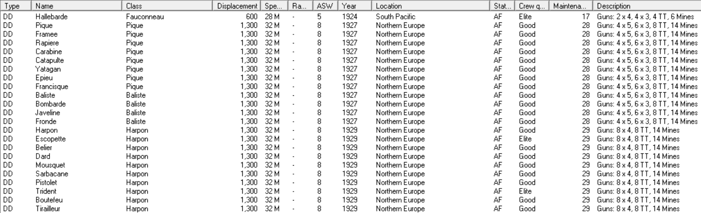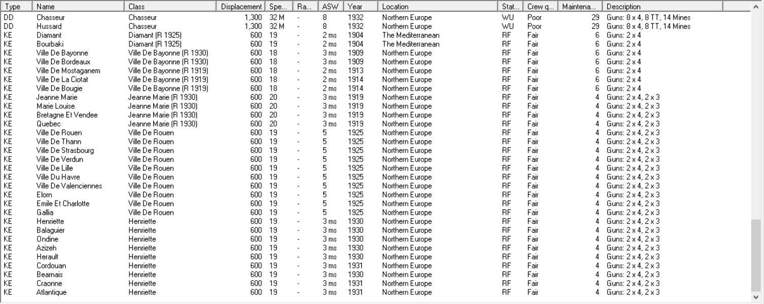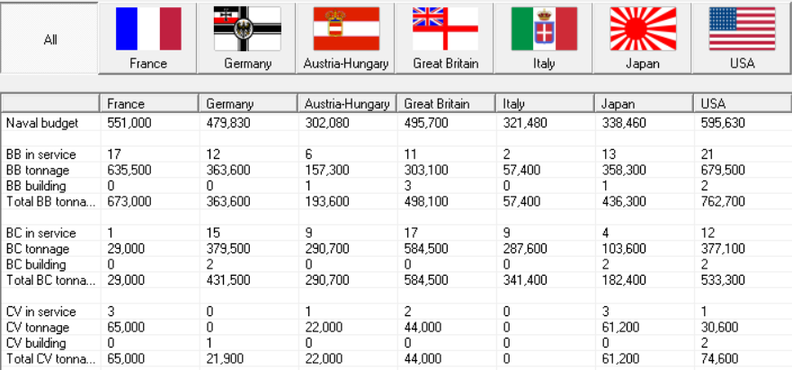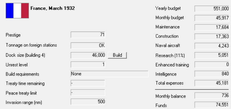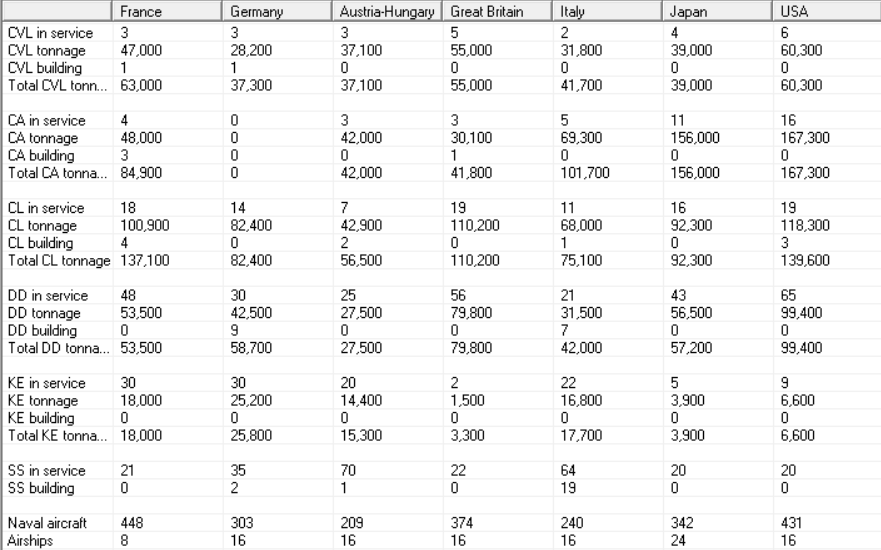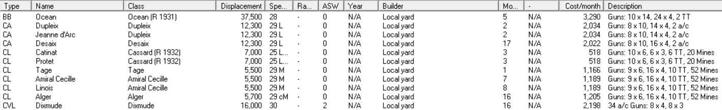 The last year has been fairly quiet, as our plans for completing our existing construction have been carried out. We have commissioned 3 BBs, a CV, a CA, 2 CVLs and 2 CLs, although postwar budget crunches have limited new construction to a CA, a CVL and a CL. We have also scrapped the Devastations and Dupetit-Thouars. Fortunately, worldwide tensions are also low, except with Austria, who has been throwing its weight around again.