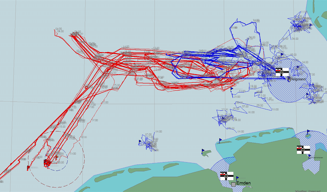 Battle at Dogger Bank. 2 BBs and a CV with destroyer screen encounter a light German force, and begin to chase down a CL. They eventually manage to bring it to a halt and pound it until it sinks. The result is a minor victory, 698 VP to 0.