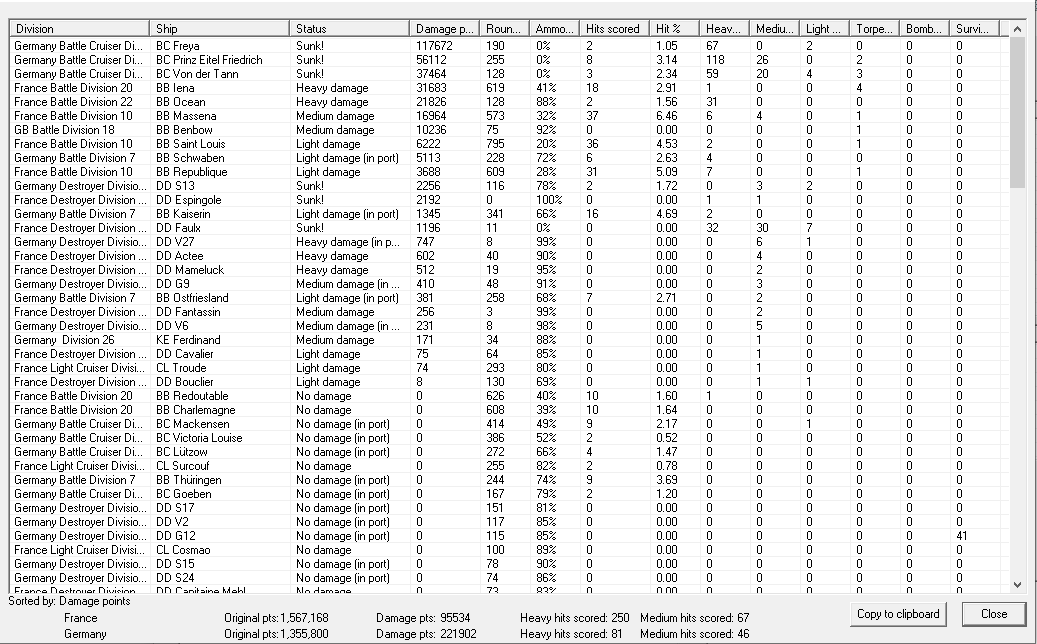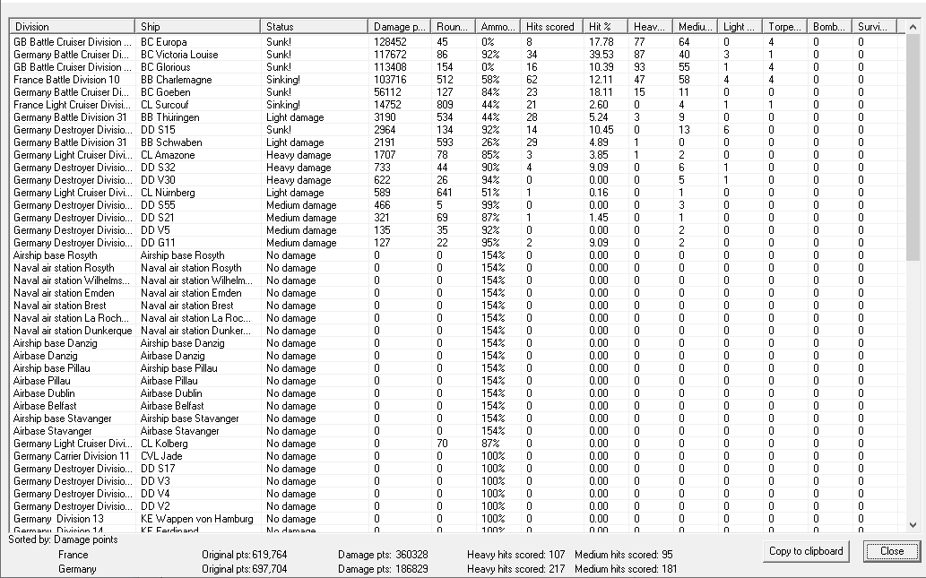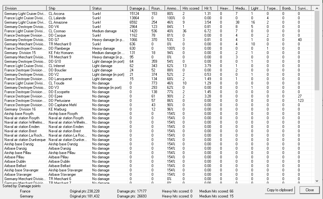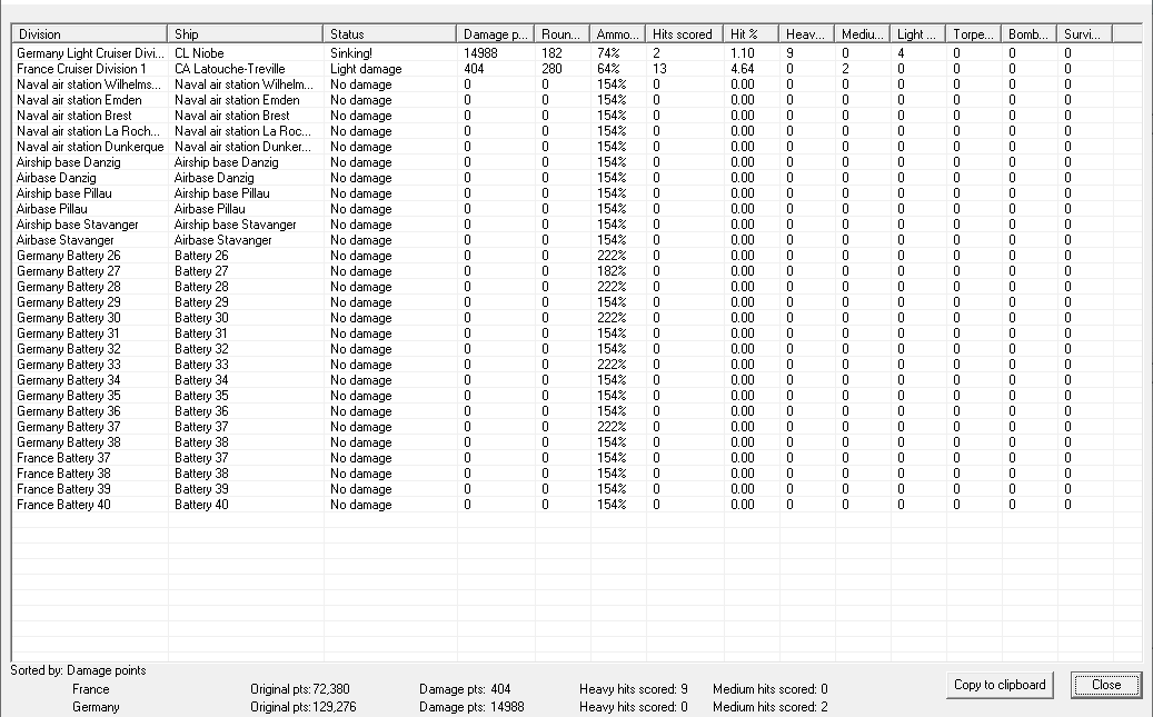 CA Latouche-Treville intercepts a German raider off Brittany. It turns out to be a CL, which takes the first 11" hit in the opening moments of the engagement. Our ship quickly gains the upper hand, pounding the CL. It sinks after a 75-minute engagement. It's a major victory for us, 1093 VP to 58 VP.