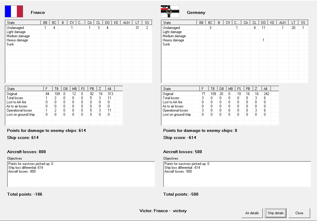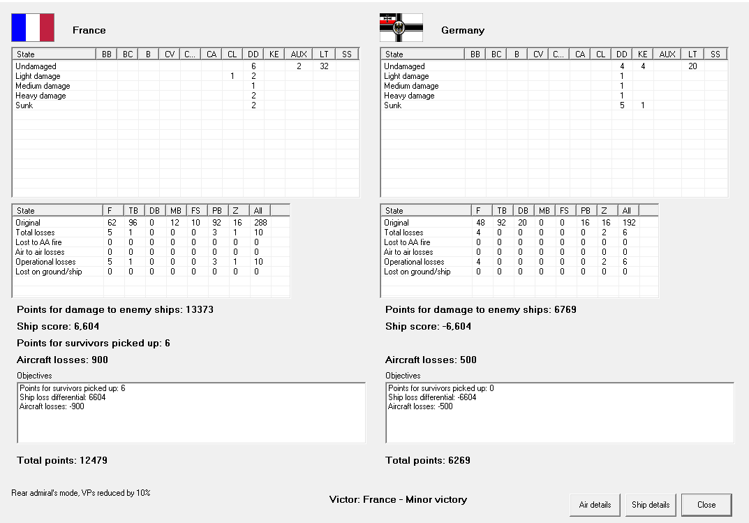 We launch another coastal raid, which sees one of our CLs squaring up against 2 of theirs. An unlucky engine hit slows our ship, although the odds are evened when one of their ships brews up after a turret hit. We quickly gain the upper hand, and pound the other CL as well as several of their destroyers, although one of our destroyers takes a torpedo and goes down. We begin to withdraw, but air attacks on ships nearby (but not under my control) sink CL Lalande. Other nearby ships take out the second enemy CL while my force withdraws. Somehow, the result of the Battle of Borkum Riff is a major victory for us, granting one prestige and 2,734 VP as opposed to 1,333 VP for them.