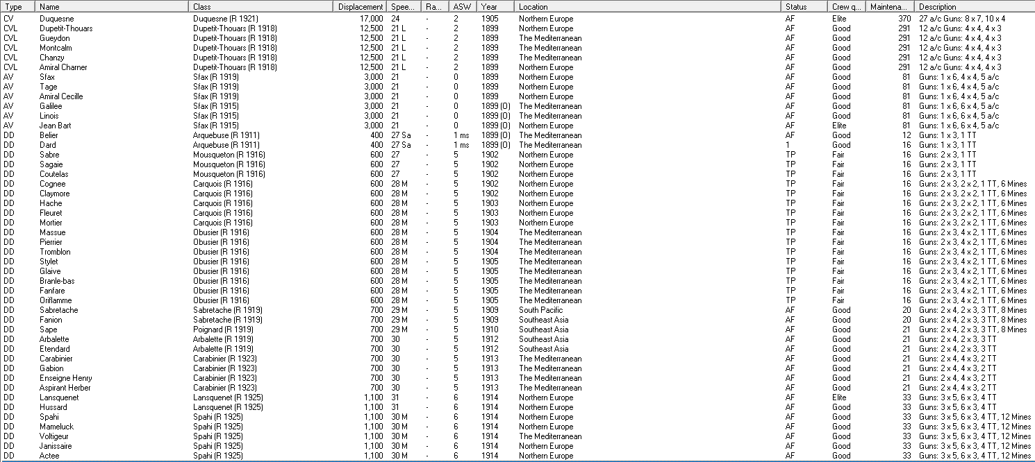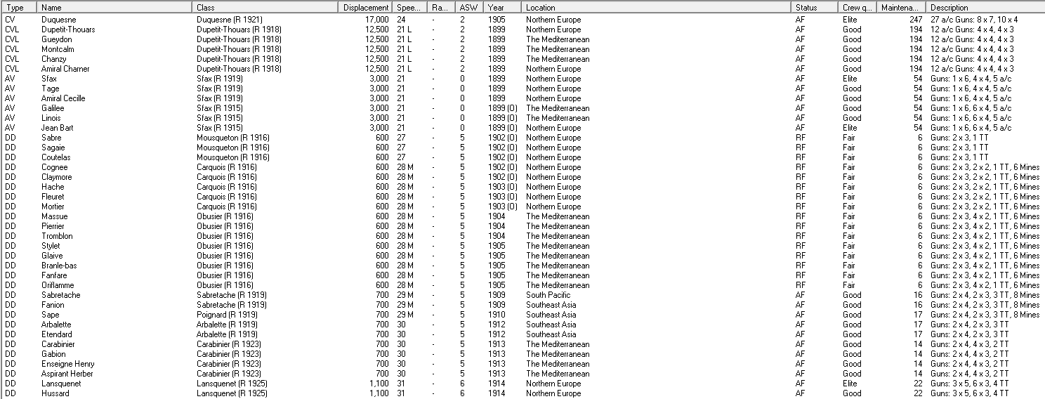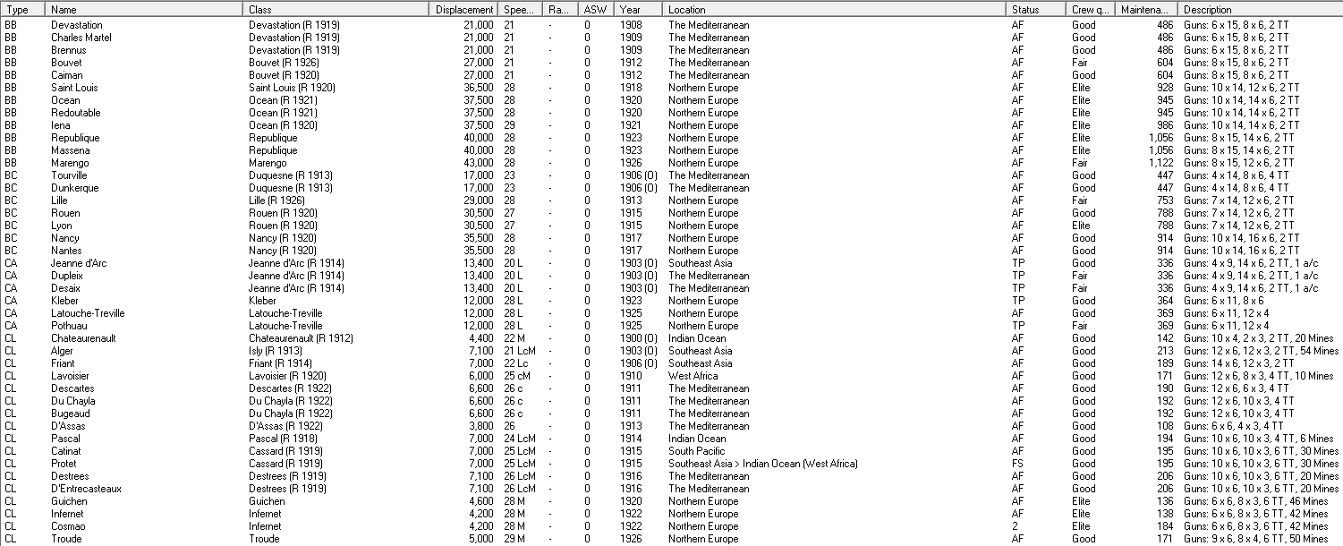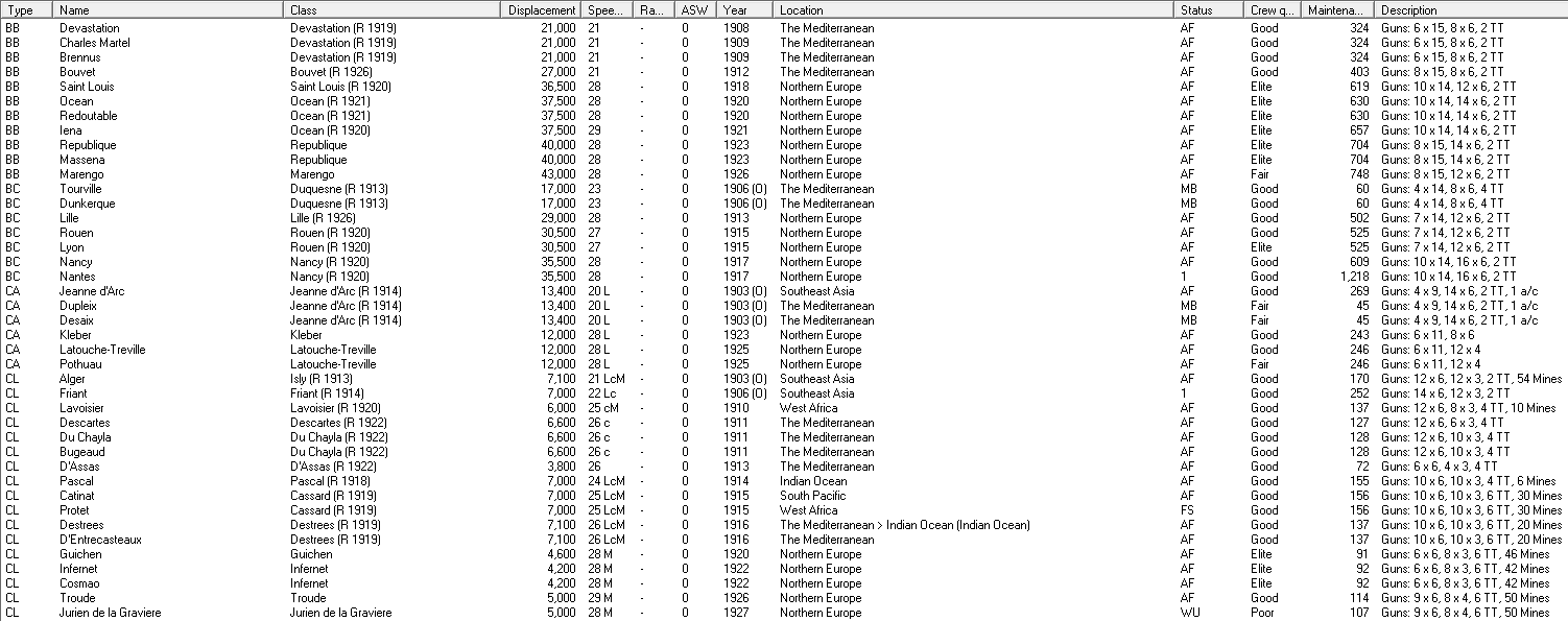 Other designs that are less urgent, but perhaps worth looking into if we have the capacity, would be more of our rather successful CAs (probably an update of Latouche-Treville, but a 2x4 10" mini-Dunkerque would also be an option), or even some larger CLs like the unfortunate Lalande, because eventually we'll want some more modern ships with colonial facilities.