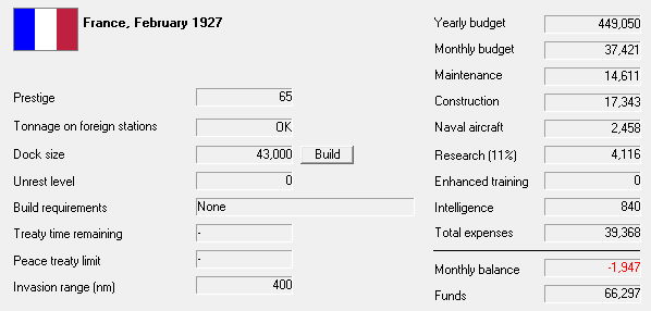 Unfortunately, even a reasonably healthy budget is a major step down from what we had in wartime, and we will have to make hard choices. After some initial mothballing, we will balance the budget next month when La Fayette commissions, but we will need to make further cuts if we want to lay down significant new construction, such as Bearn, or more new destroyers. We have recently made advances in that area allowing us to have twin turrets, and the staff would propose a design with four twin 4" turrets.