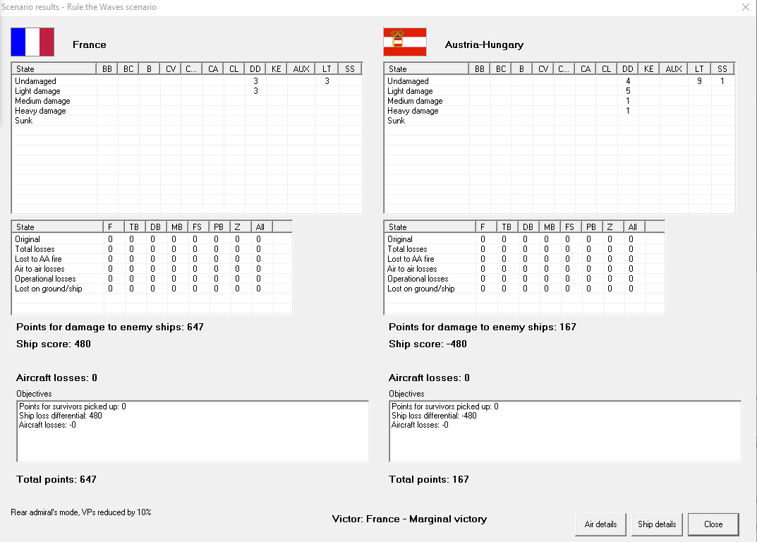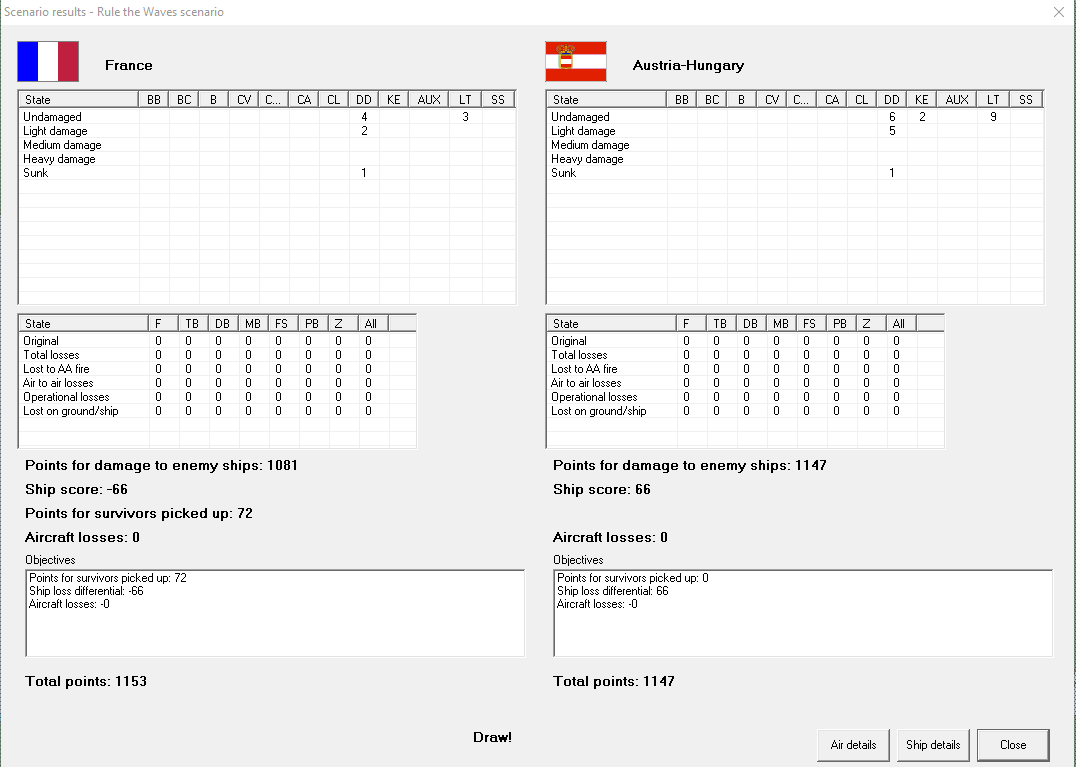 Destroyer action in southern Adriatic (again). This time we have 4 French and 3 UK DDs vs 10 Austrian DDs. This time, a handling error results in a close melee. We're hit several times, but seem to do more damage than is done to us. DD Obusier takes a torpedo and immediately begins sinking. Our commander pauses only to rescue her survivors, then withdraws. Apparently, enough damage was done to sink one of their DDs, leaving the result a draw. 142 VP each.