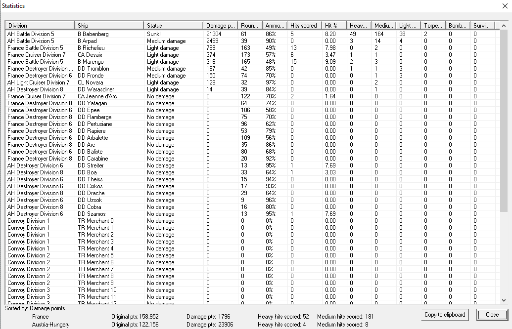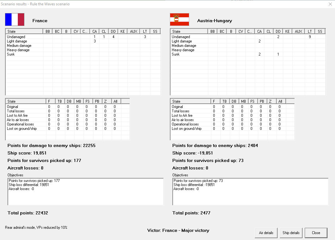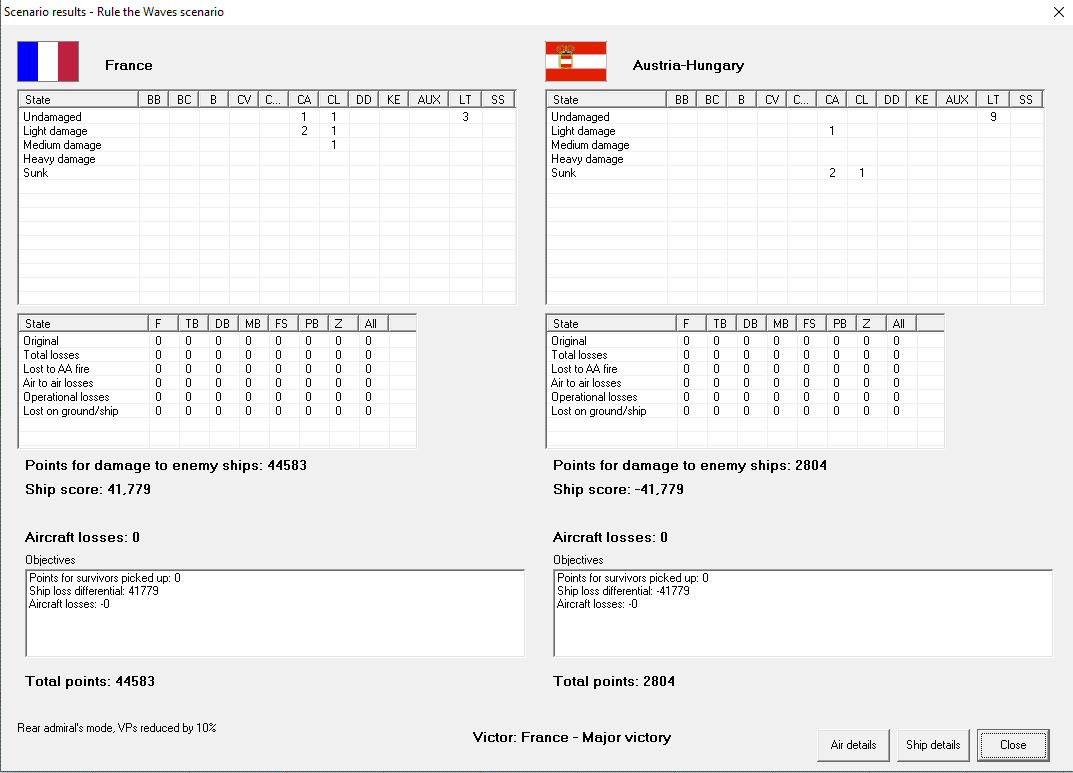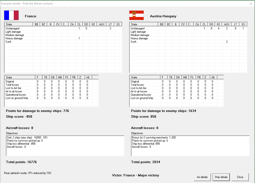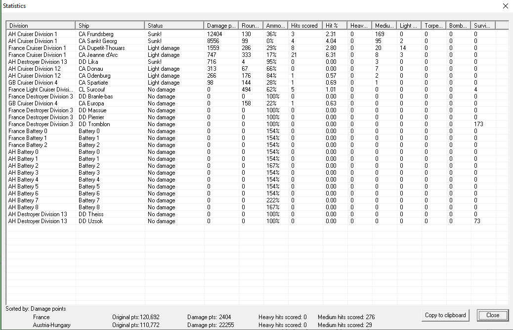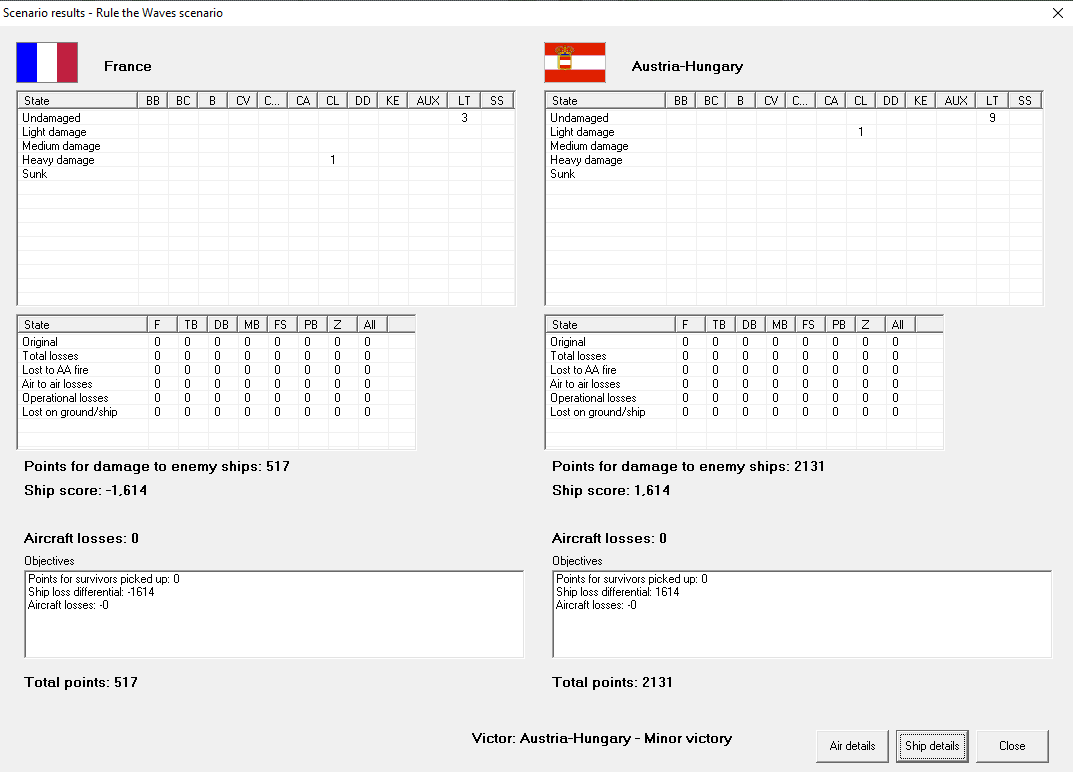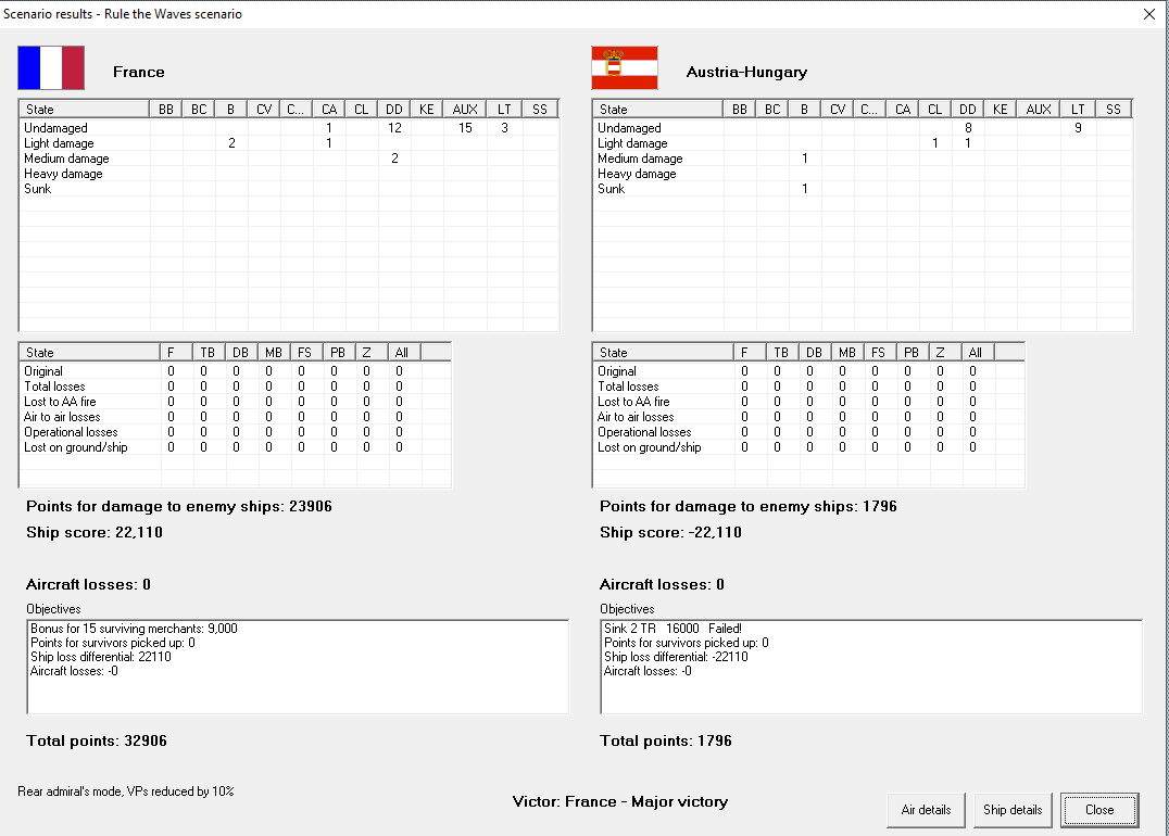 Coastal raid on Austro-Hungarian coast. A pair of light cruisers prowl the Adriatic, sinking three merchant ships and a pair of corvettes. They face no opposition. Major victory, +1 prestige, 1363 VP, while they get only 100.