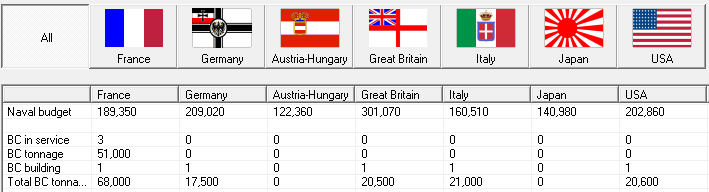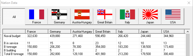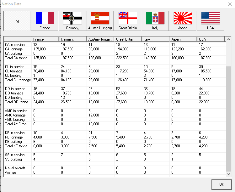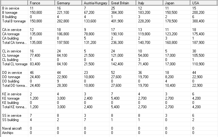 The Nation data doesn't seem to show information on BBs or BCs, despite those being the most important types of warship. Also, looking past the current war, it might be worth while moving the focus of our naval intelligence service to Germany. I'm assuming that the Devastation class is similar to BB-05-II?