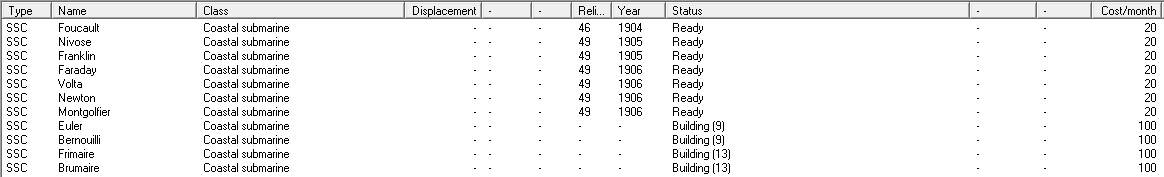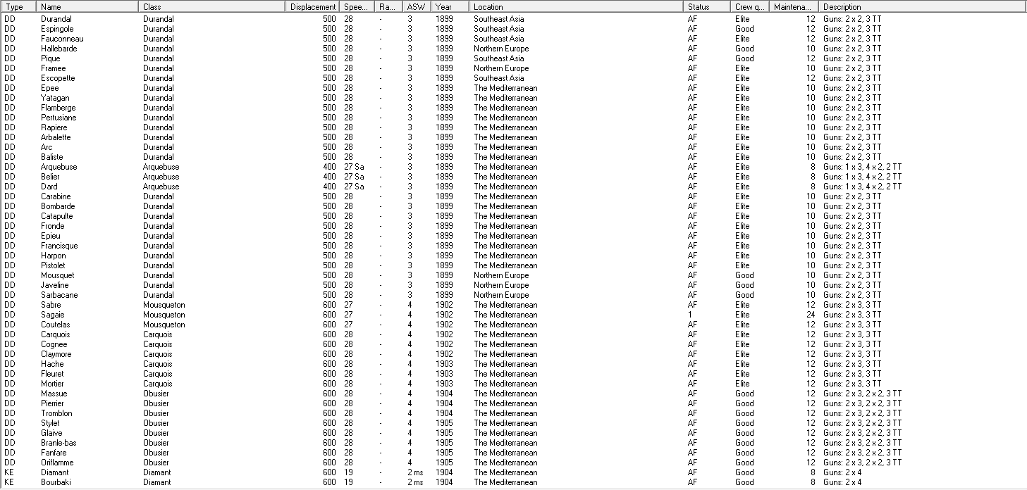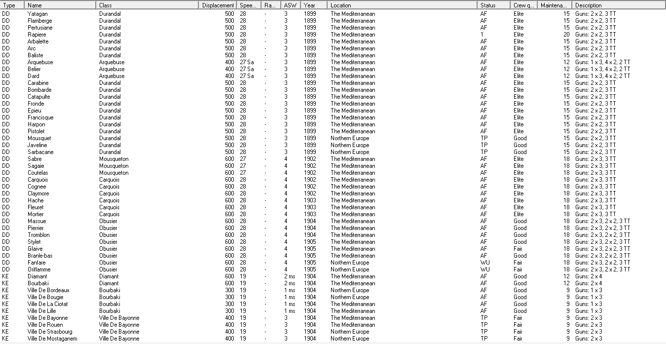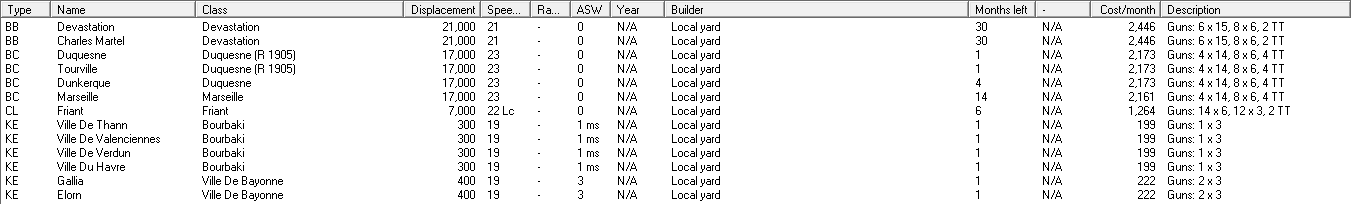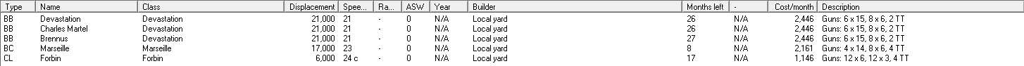 Proposed mothballing/suspension plan - SWAG version: The first thing I'm going to do is lay up the Sfax class. They're annoying, but could be useful in the future. After that, we'll also lay up both Friedlands and two of the Richileus. Another two of the later will begin refits for better fire control. When they finish, I'll send 2 more in, lasting until everyone is refitted and 4 of the ships are still in reserve. I'll immediately suspend Marseilles and Forbin, along with the submarines. If needed, Brennus will be suspended, too, although her reactivation will be at the top of the priority list. The D-T class CAs will also be cycled, with two of the refitted ships going to SEA (assuming I can't replace one with a CL), and some of them being reserved after refit. The Brux class CAs are probably headed for reserve, too, as their design is obsolescent and they aren't nearly as useful as the bigger CAs.
