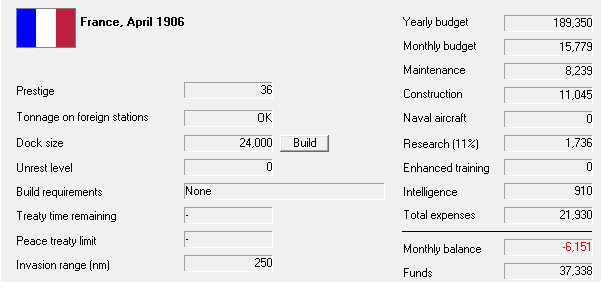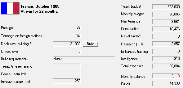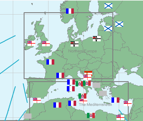 Design work on new Forbin-class CL begun. 2 new SSC laid down. BC Duquesne commissioned. Tourville delayed by equipment delivery problems. On trials, they are found to easily surpass their design speed. Plans for Austrian CL Aurora stolen. Breakthrough: DD of up to 700 tons displacement. 1 Friendly sub lost, 3 merchant ships sunk by raiders. AH has laid down a CA, UK a BC, Italy a B. Italy and Germany are building coastal batteries. Germany commissions DD, US and UK CAs. 230 VP from blockade, increasing protests in Austria.
