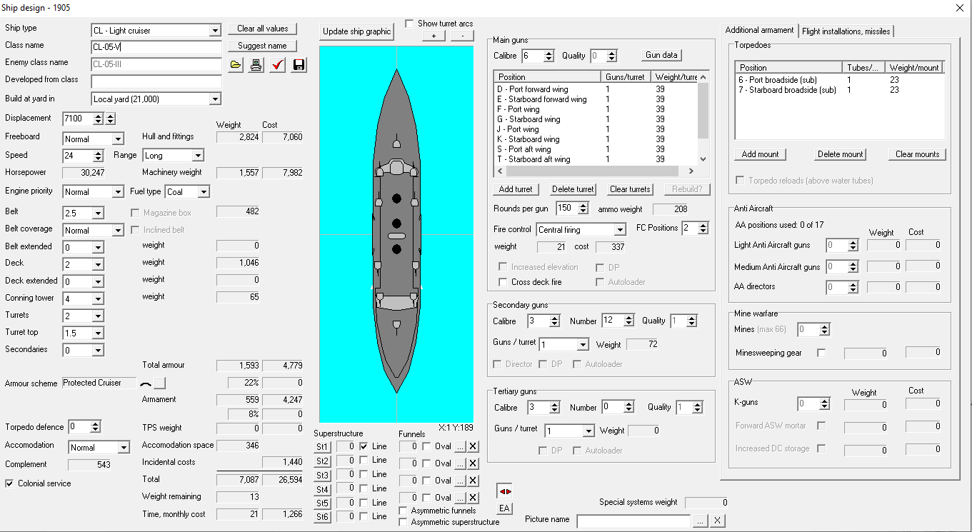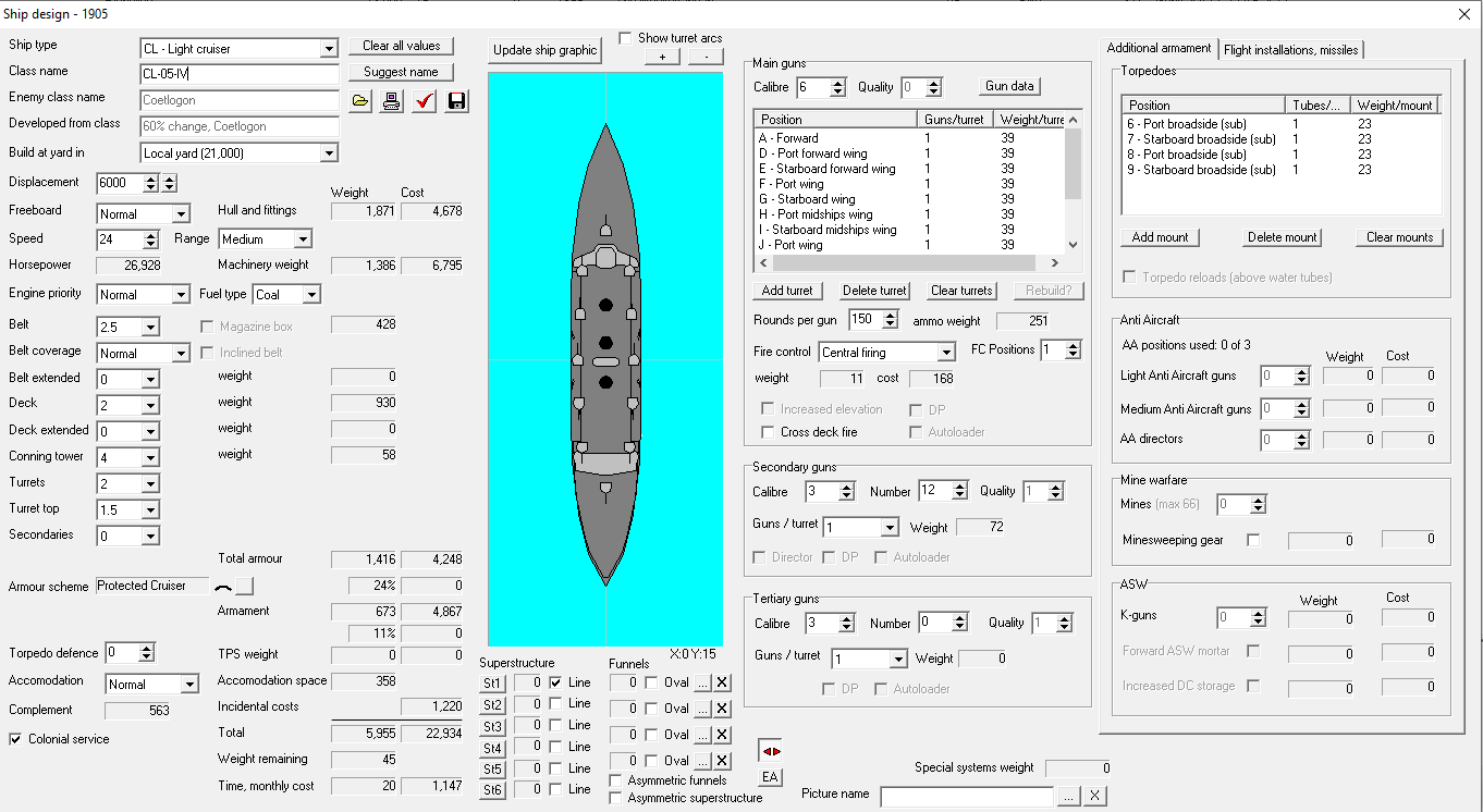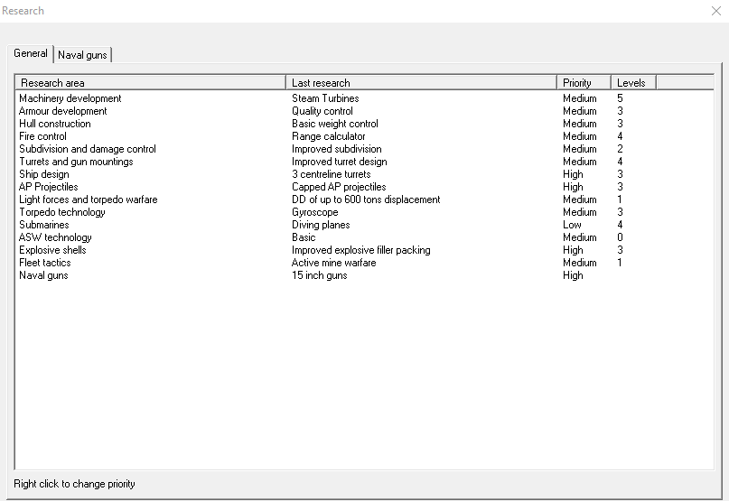 At this point, significant decisions have to be made about the shape of the postwar fleet. The recent development of the steam turbine has greatly aided us in these efforts, allowing most of our fast designs an extra knot on the same tonnage. We could lay down more Devastations, design a new battlecruiser, or rebuild our light cruiser force. It's also worth pointing out that we'll complete a dock expansion to 24,000 tons in 6 more months.1