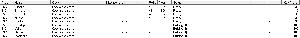We should also consider if any cancellation/scrapping is in order. I'd say to cancel the subs in progress--we can build higher-tech ones later. Not sure I want to part with anything else--even the Sfax seemed to find its role.