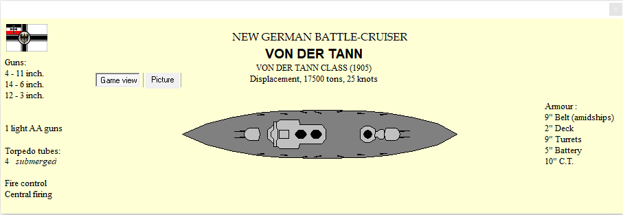 The Von der Tann looks to be from the same conceptual mold as the Duquesne, only with 11" guns instead of 14" and an extra 2 kts of speed. The difference is that they have one under construction, and we have three in service. The extra speed will be annoying, but I'd still bet on us to win the fight. In firepower terms, she's probably a match for a typical B, particularly if the 11" guns are good.